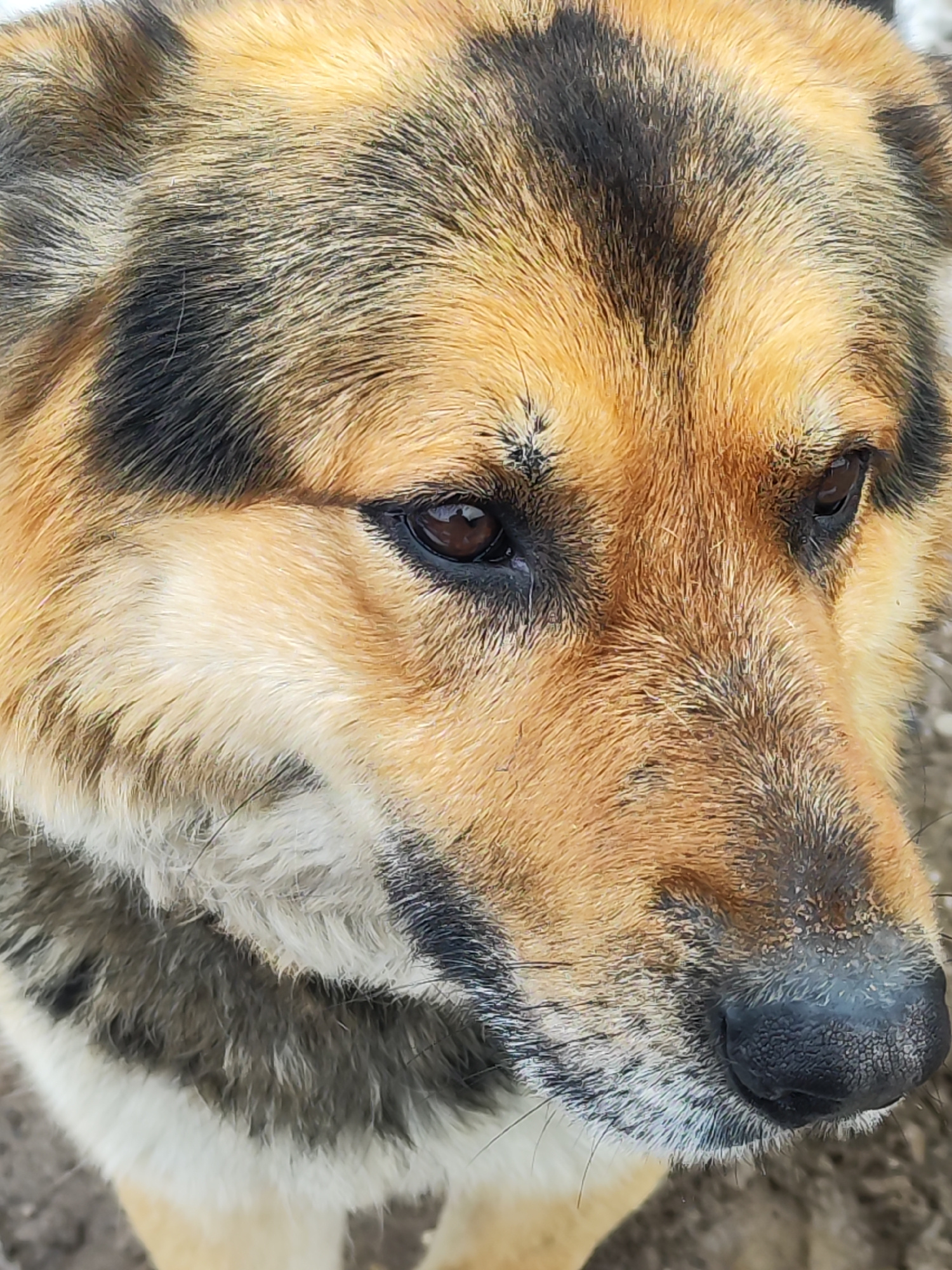Close-up of a dog's face. The dog has brown eyes, a black nose, and brown, black, and white fur. The background is out of focus, but appears to be an outdoor environment. This image was taken in the c…read more