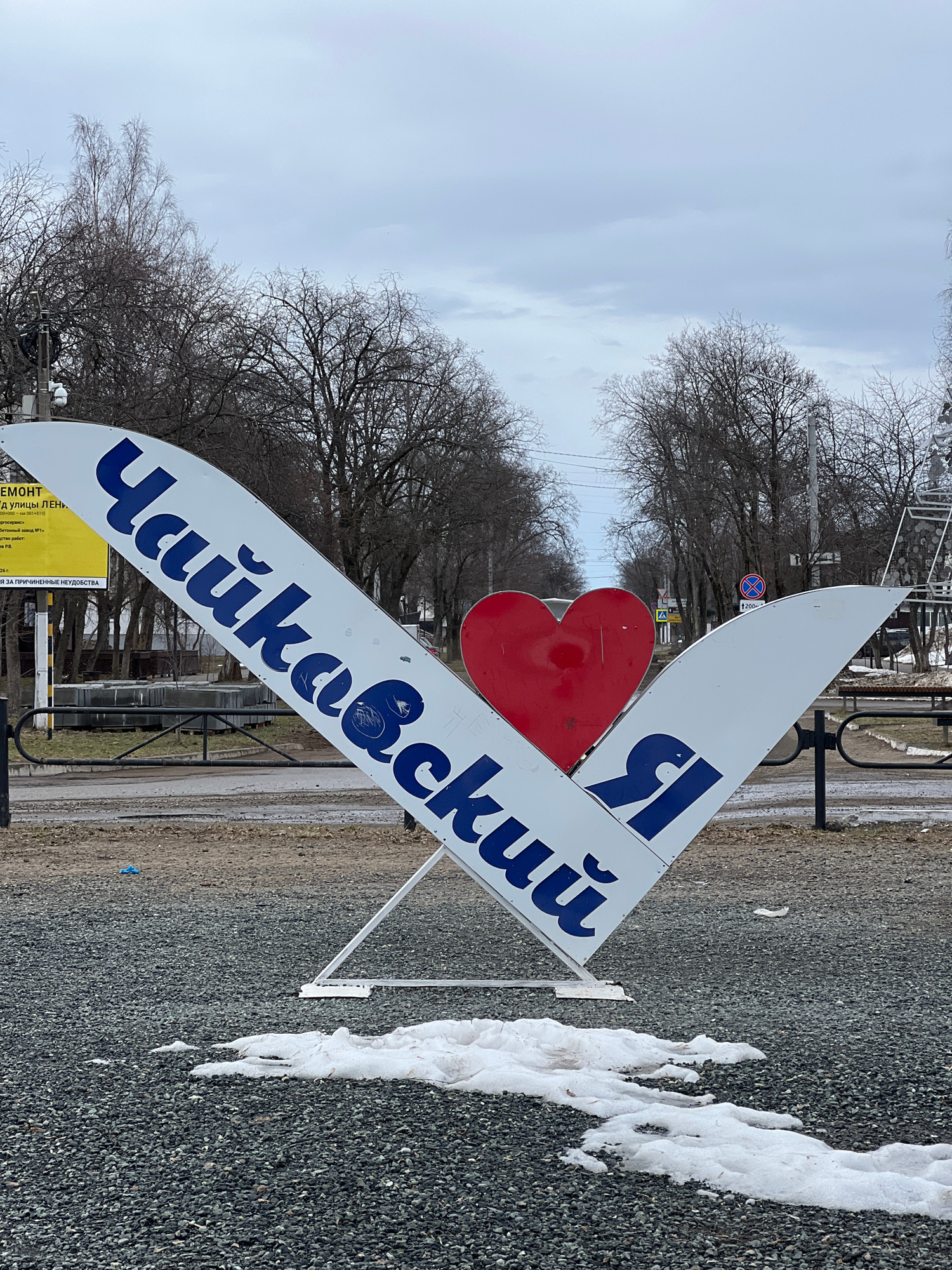 The image captures a roadside sign in Chaikovsky, Russia. The sign is designed to resemble an "I love" graphic, where the word "love" is replaced with a red heart, and the city name "Chaikovsky" is wr…read more