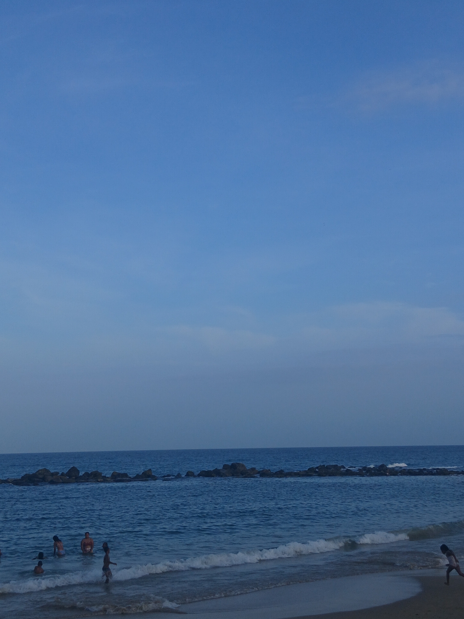 The image shows a beach scene, likely in Porlamar, Venezuela, as indicated by the prompt. The view is oriented vertically, with the sky occupying a substantial portion of the left side. The sky is pre…read more