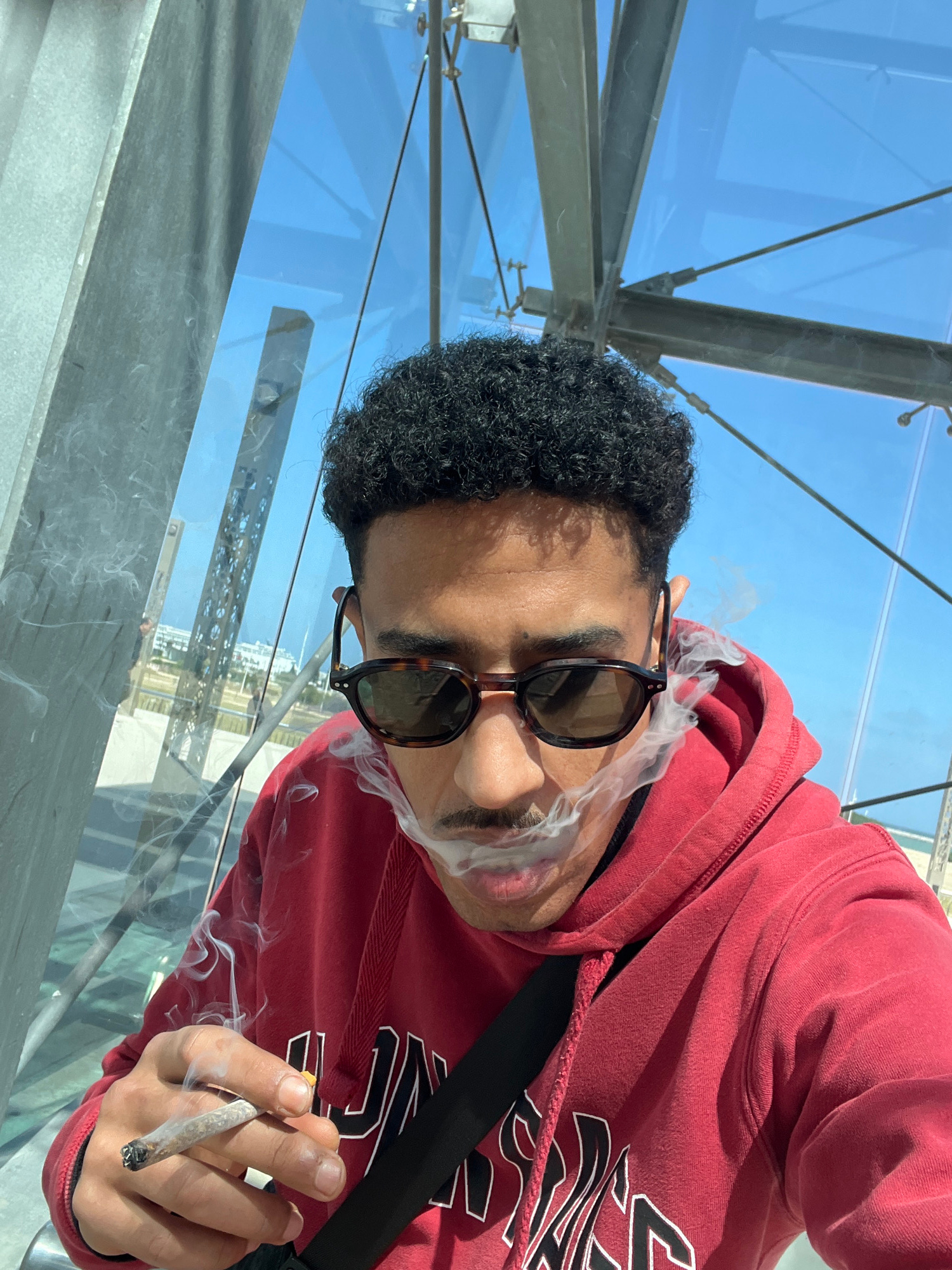 A male individual is depicted in a close-up, selfie-style photograph, positioned within a modern architectural structure composed of glass panels and steel beams under a clear blue sky. The individual…read more