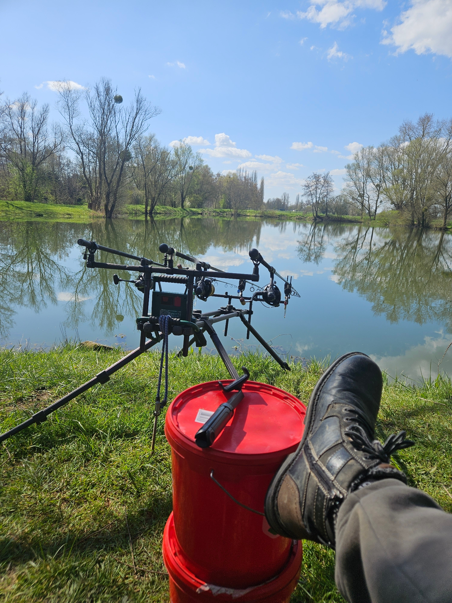 A fishing scene unfolds in Gavisse, France, beside a tranquil body of water reflecting the sky and surrounding trees. A fishing rod stand, equipped with multiple fishing rods, sits poised at the water…read more