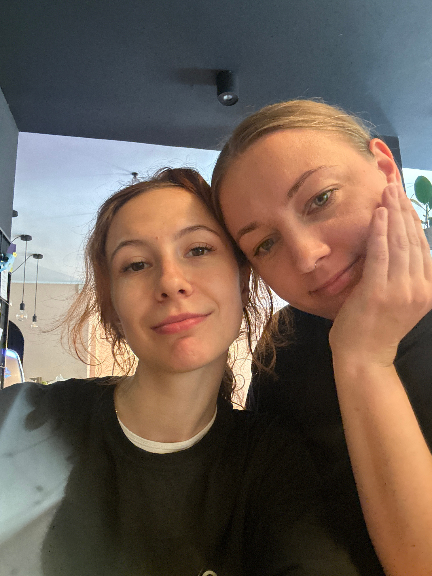 Two women pose closely for a selfie. The woman on top has blonde hair and rests her hand on her face. The woman below has brown hair. Both wear black shirts. The location appears to be an interior spa…read more