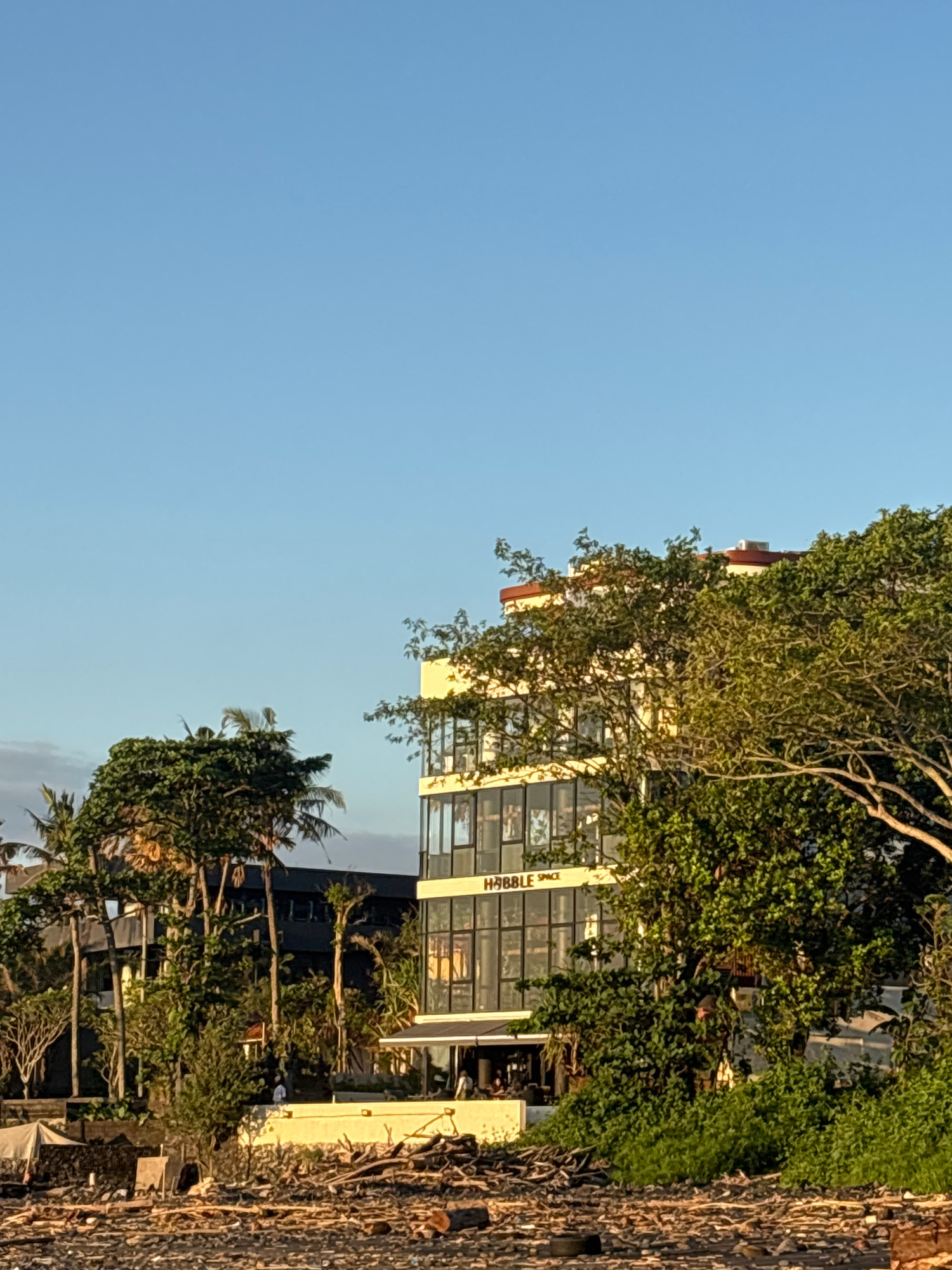 The image displays a modern, multi-story building surrounded by dense tropical foliage under a clear, bright blue sky. The building features large, dark-framed glass windows and light-colored walls, p…read more