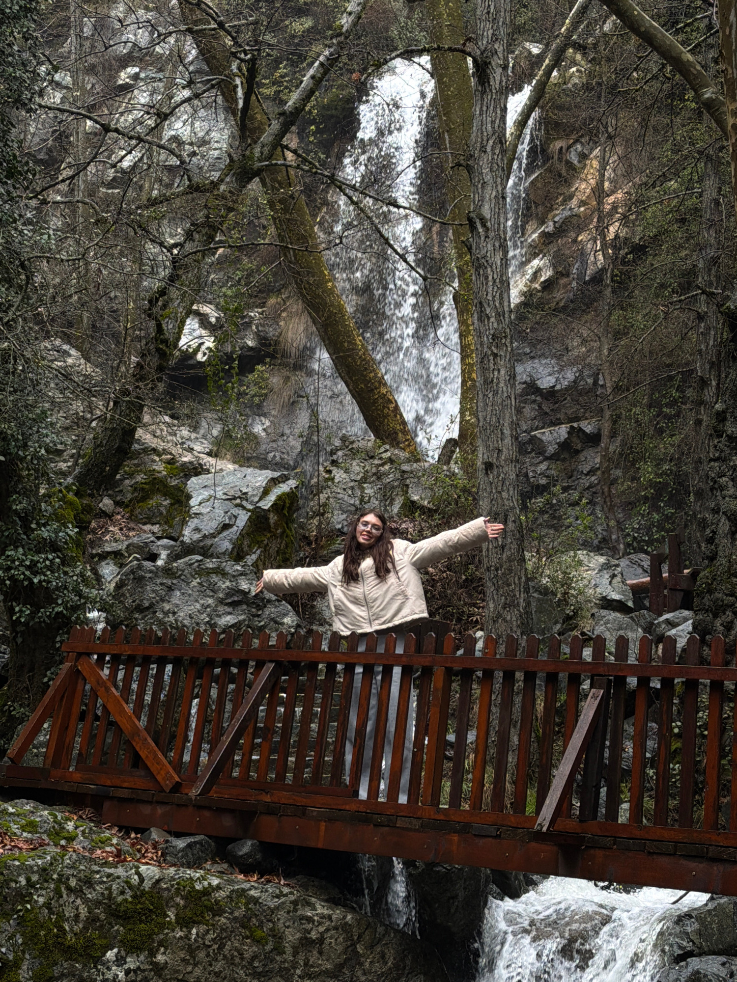A full shot of a woman standing on a bridge over a waterfall, taken at an angle. The image is rotated 180 degrees, giving the impression the woman is upside down. The woman has long, brown hair and i…read more