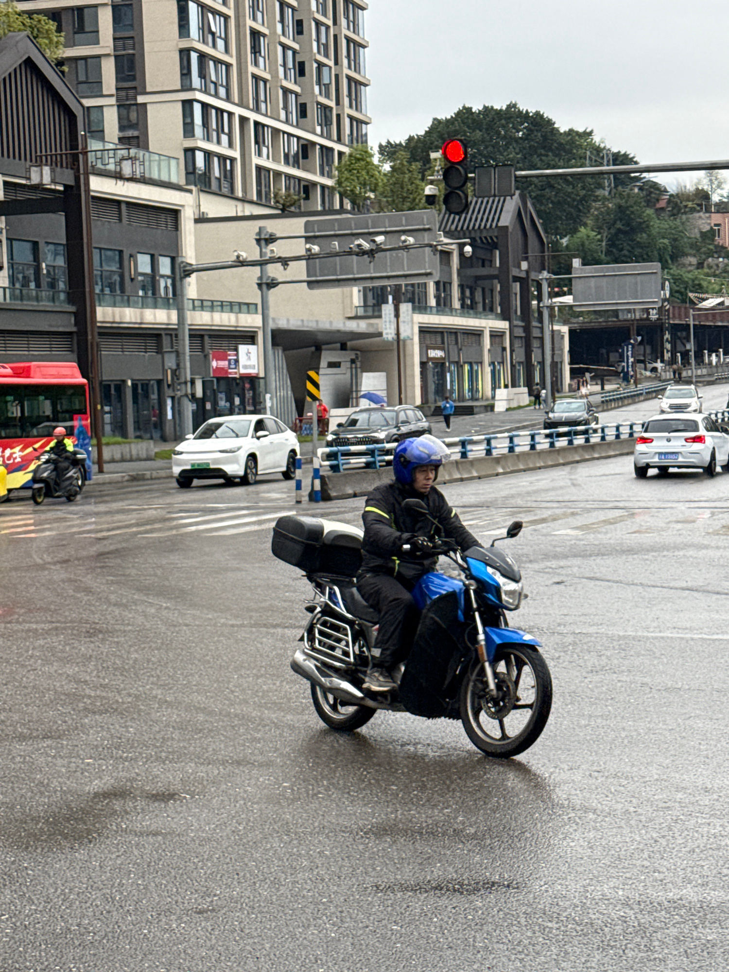A man is riding a blue motorcycle on a wet road in what appears to be the Shapingba District, China. A red traffic light is visible, and there are buildings and vehicles along the street.