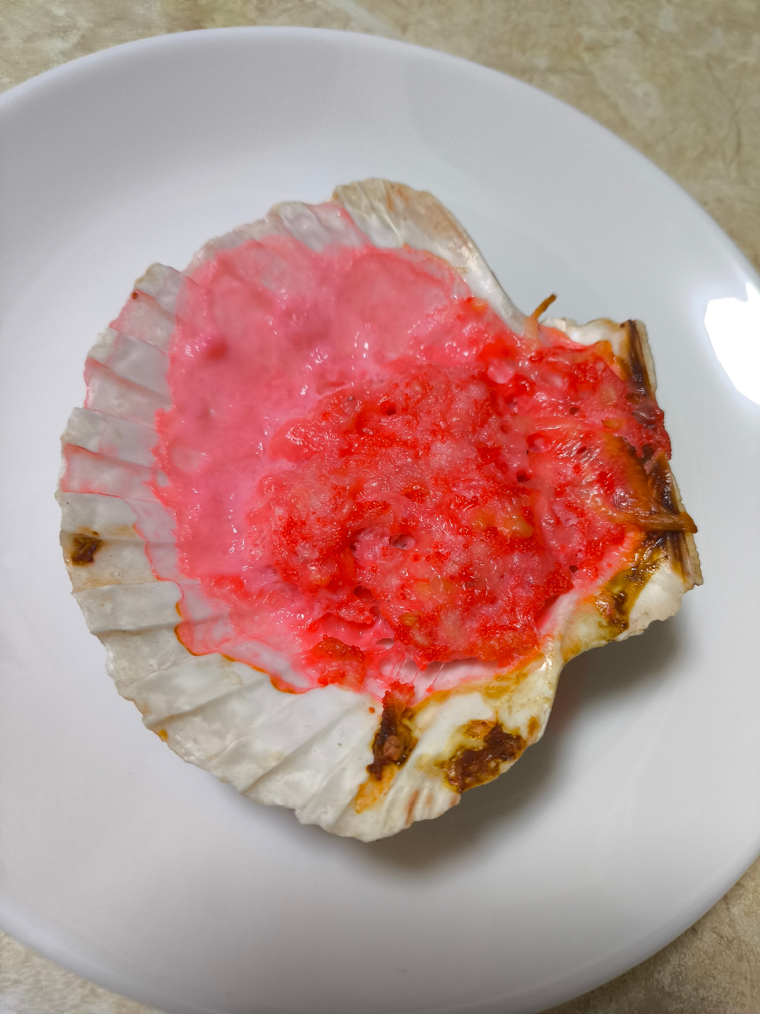 A baked scallop, topped with a pink sauce and red granular topping, is presented on a white plate. The edges of the scallop shell appear browned and slightly burned. The background appears to be a plaβ¦read more