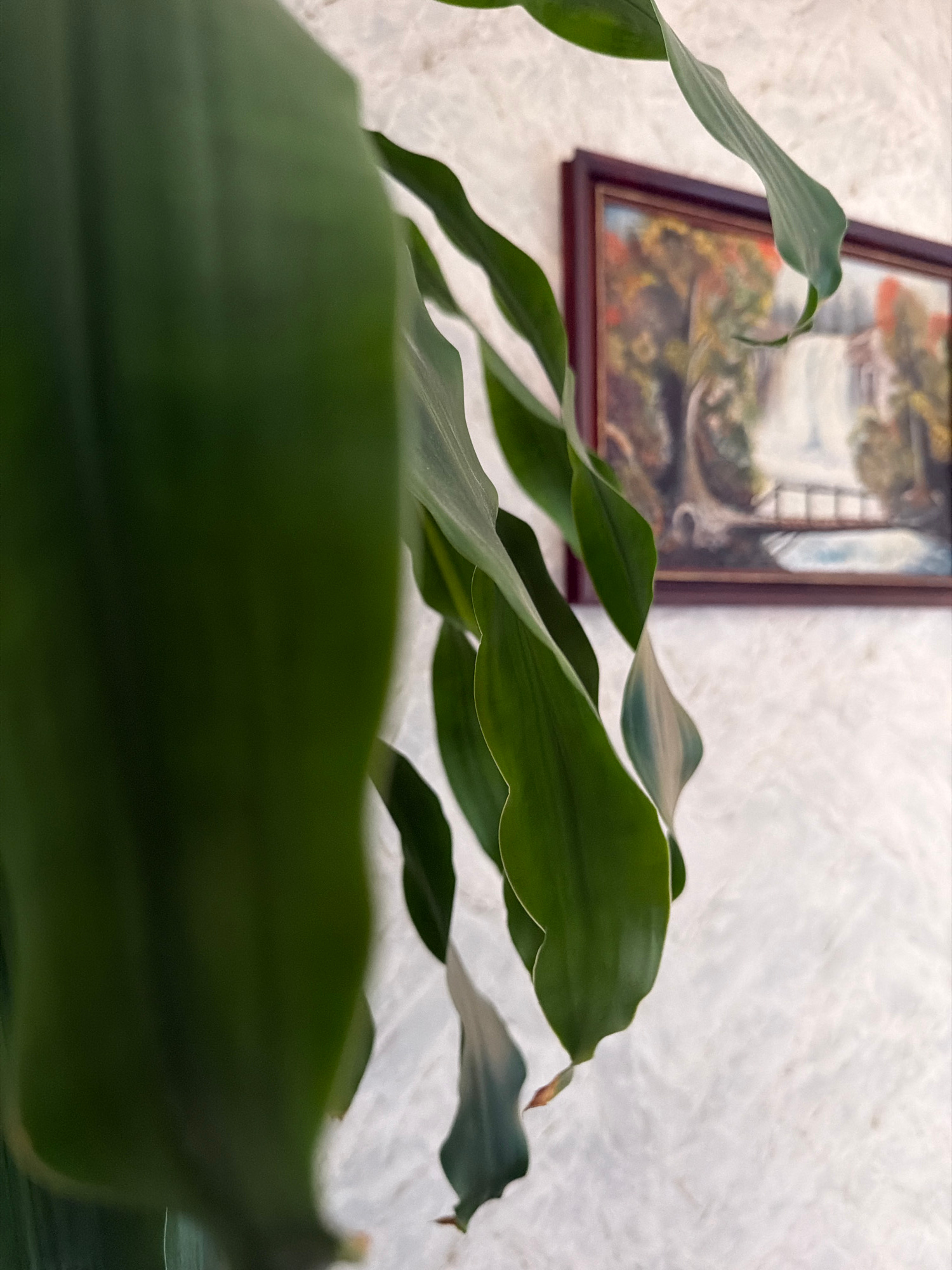 The image depicts a close-up view of green leaves, likely from a houseplant, with a blurred painting hanging on a white wall in the background. The wall has a textured surface. The exact location with…read more