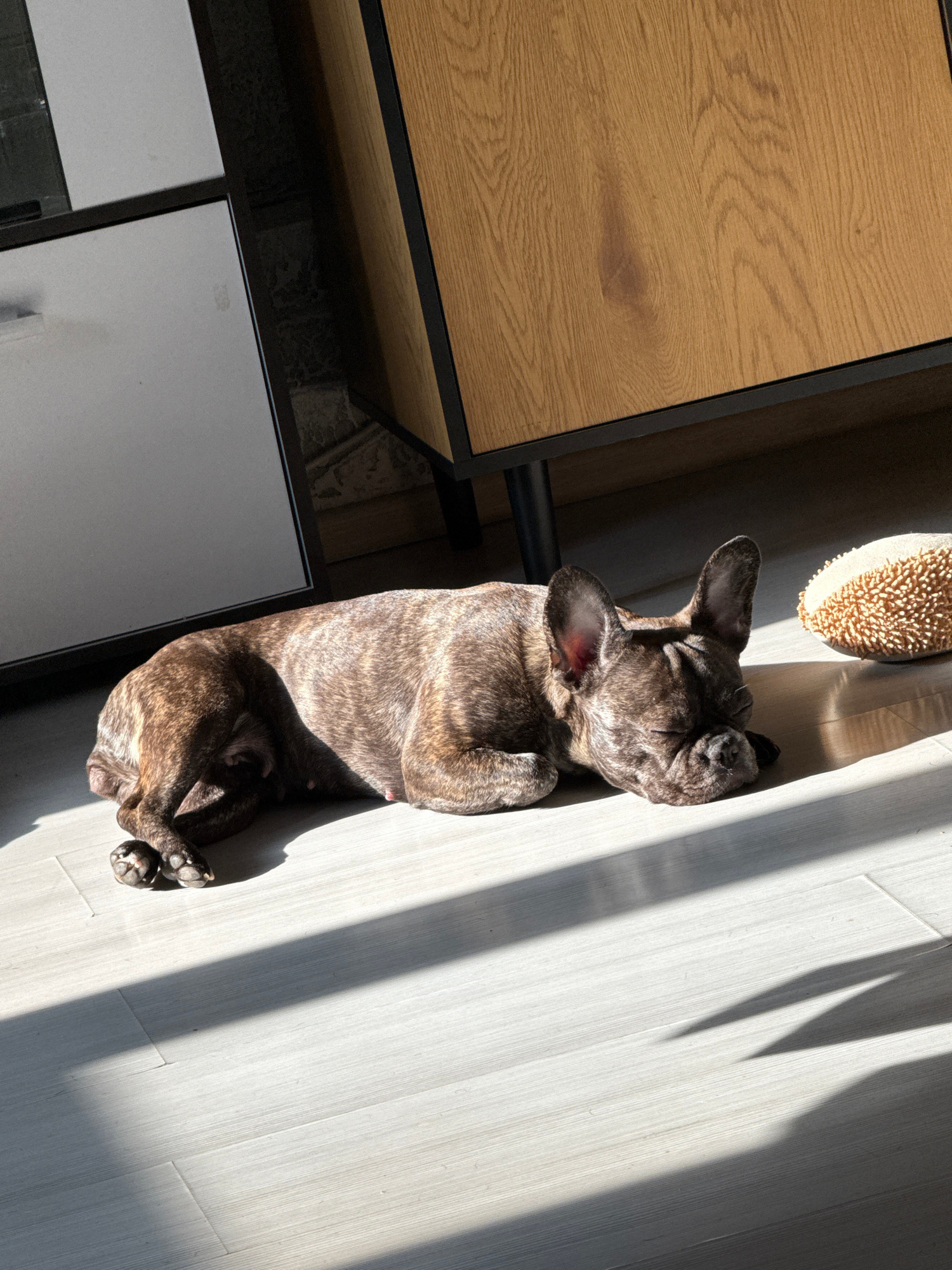 The scene is an interior shot, brightly lit by sunlight streaming through, potentially a window. A brindle French Bulldog is lying on its back on light-colored wood-patterned flooring. The dog appears…read more