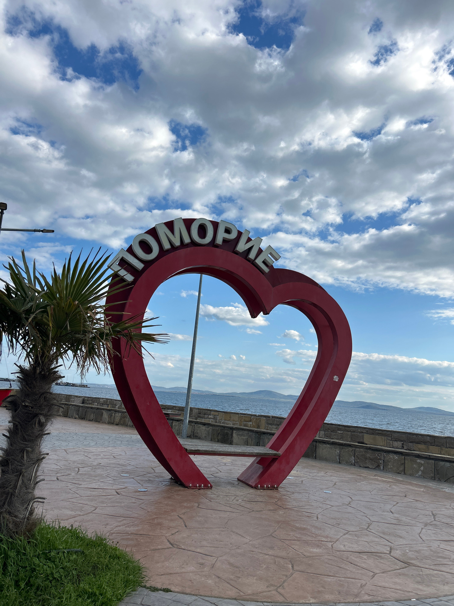 The image displays a vibrant outdoor scene dominated by a large, red, three-dimensional heart-shaped sculpture. White Cyrillic letters spelling "ПОМОРИЕ" (Pomorie) are affixed along the upper curve of…read more