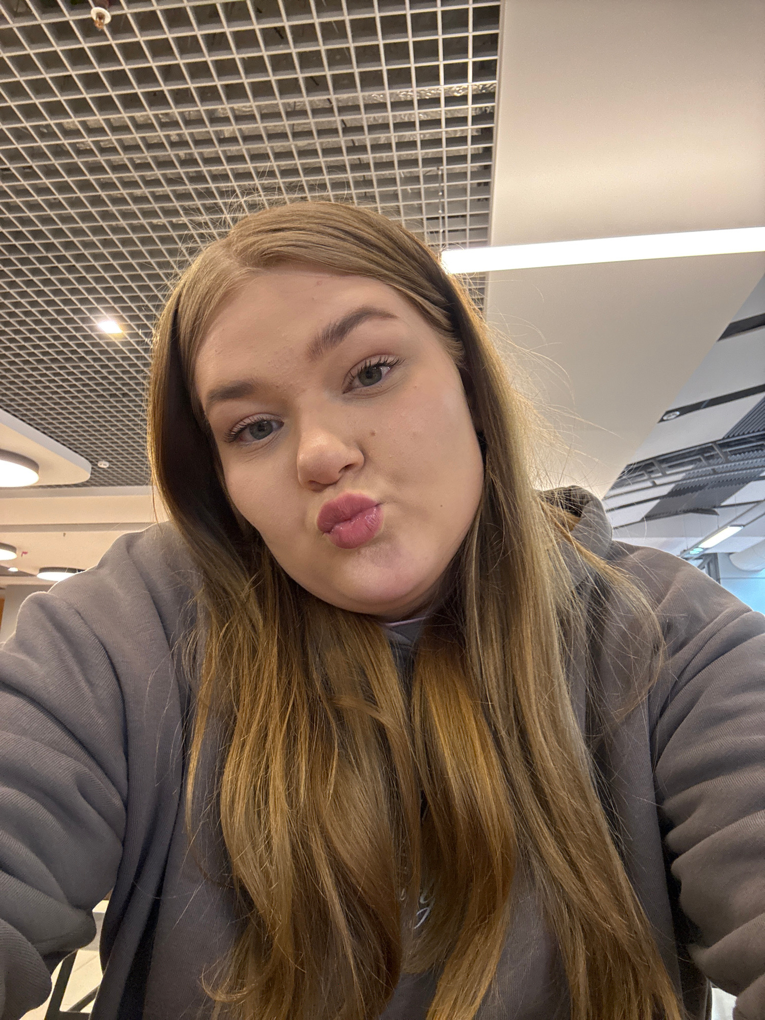 A young woman with long, light brown hair and fair skin is facing the camera with her lips pursed. She is wearing a gray hooded sweatshirt. The background includes a wall with a grid-like pattern and…read more