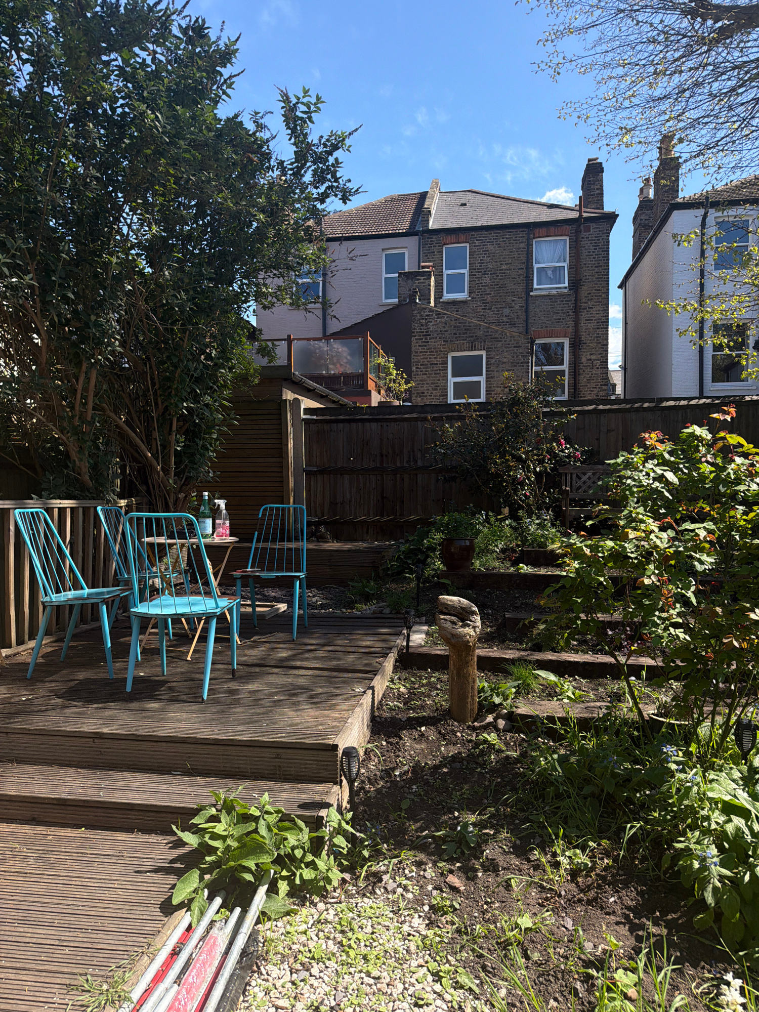The image shows a garden in London, United Kingdom. The scene features a wooden deck with a set of blue chairs and a small table. On the table are several glass bottles. The deck leads to a garden witβ¦read more