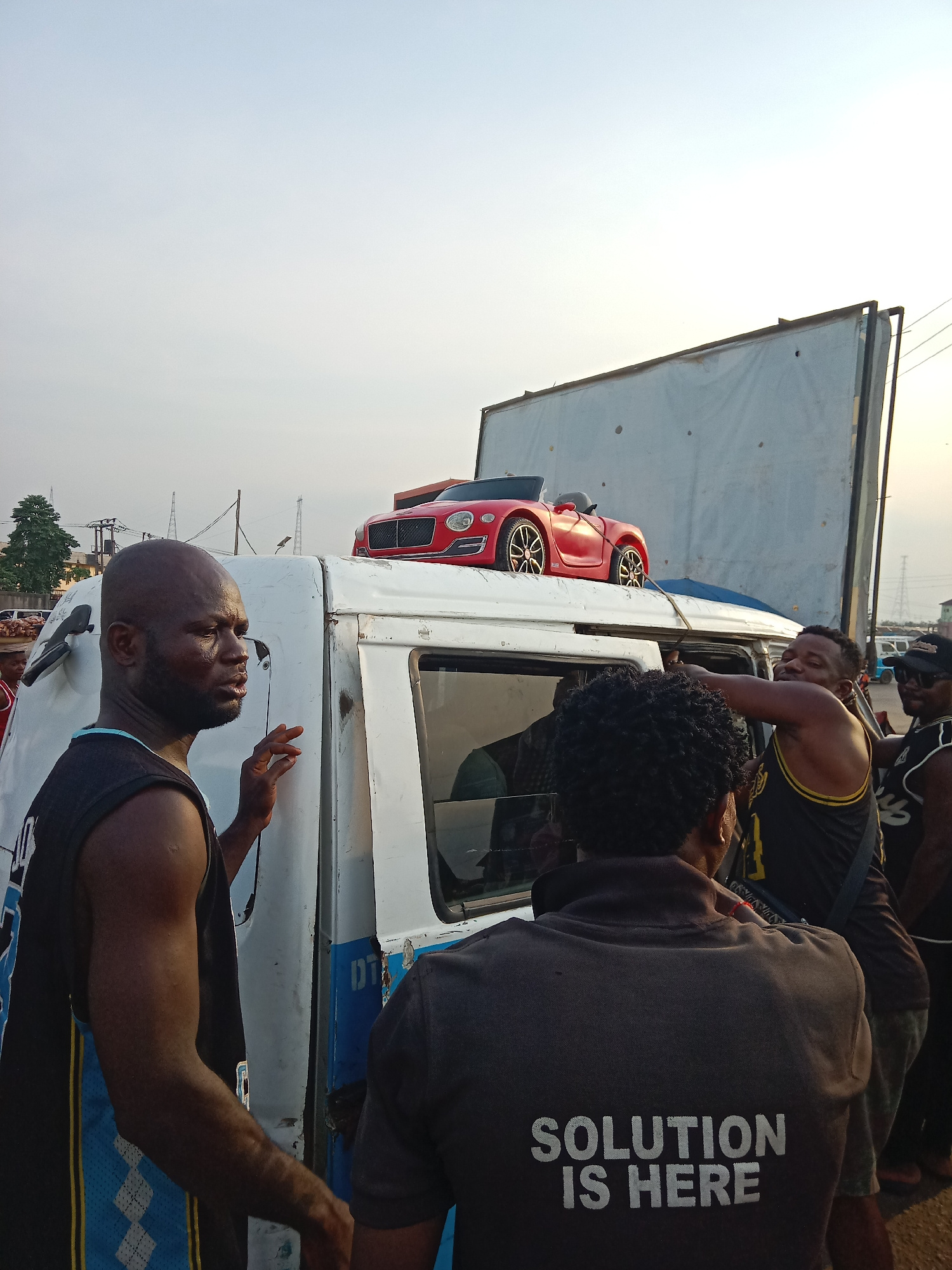 A group of people stand around a white van. A red toy car sits atop the van's roof next to a large, light-colored, rectangular object, possibly a sign or advertisement. One man, bald with a beard, sta…read more