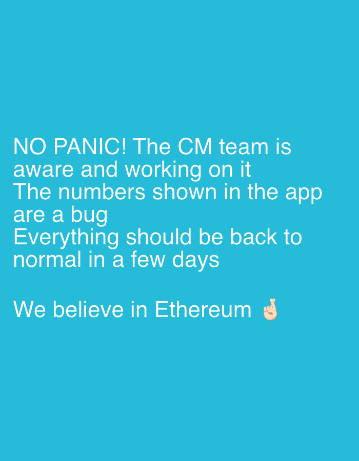 The image is a bright cyan square with white text in the center. The message reads "NO PANIC! The CM team is aware and working on it. The numbers shown in the app are a bug. Everything should be back…read more