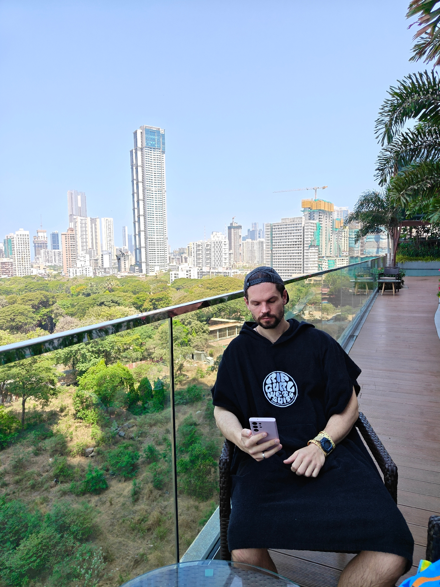 An adult male is seated in a dark wicker chair on an outdoor elevated terrace, overlooking the cityscape of Mumbai, India. The terrace features light brown wooden decking, a glass and metal railing, aβ¦read more