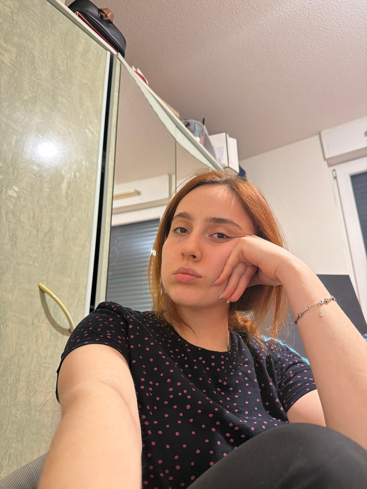 A woman with reddish-brown hair and fair skin rests her face on her hand, wearing a black shirt with pink polka dots and black leggings. She is also wearing a silver bracelet on her wrist. The image i…read more