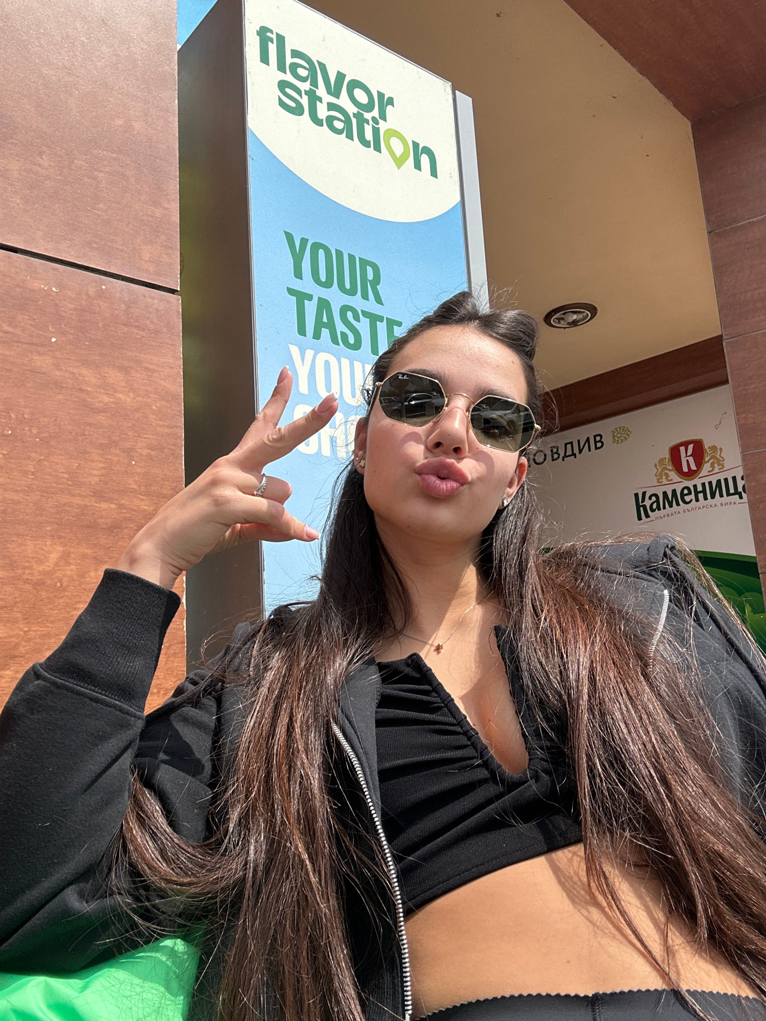 A young woman poses outdoors in Plovdiv, Bulgaria. She wears sunglasses and dark clothing. She is making a hand gesture. Behind her are signs in Bulgarian, including one for "Каменица" beer and anothe…read more