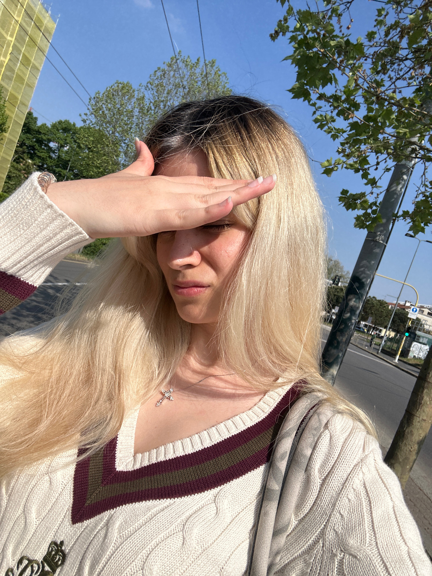 The image captures a young woman outdoors in what appears to be an urban setting, under a clear and sunny sky, with Milan, Italy as the provided location context. She is seen from a tilted, slightly o…read more