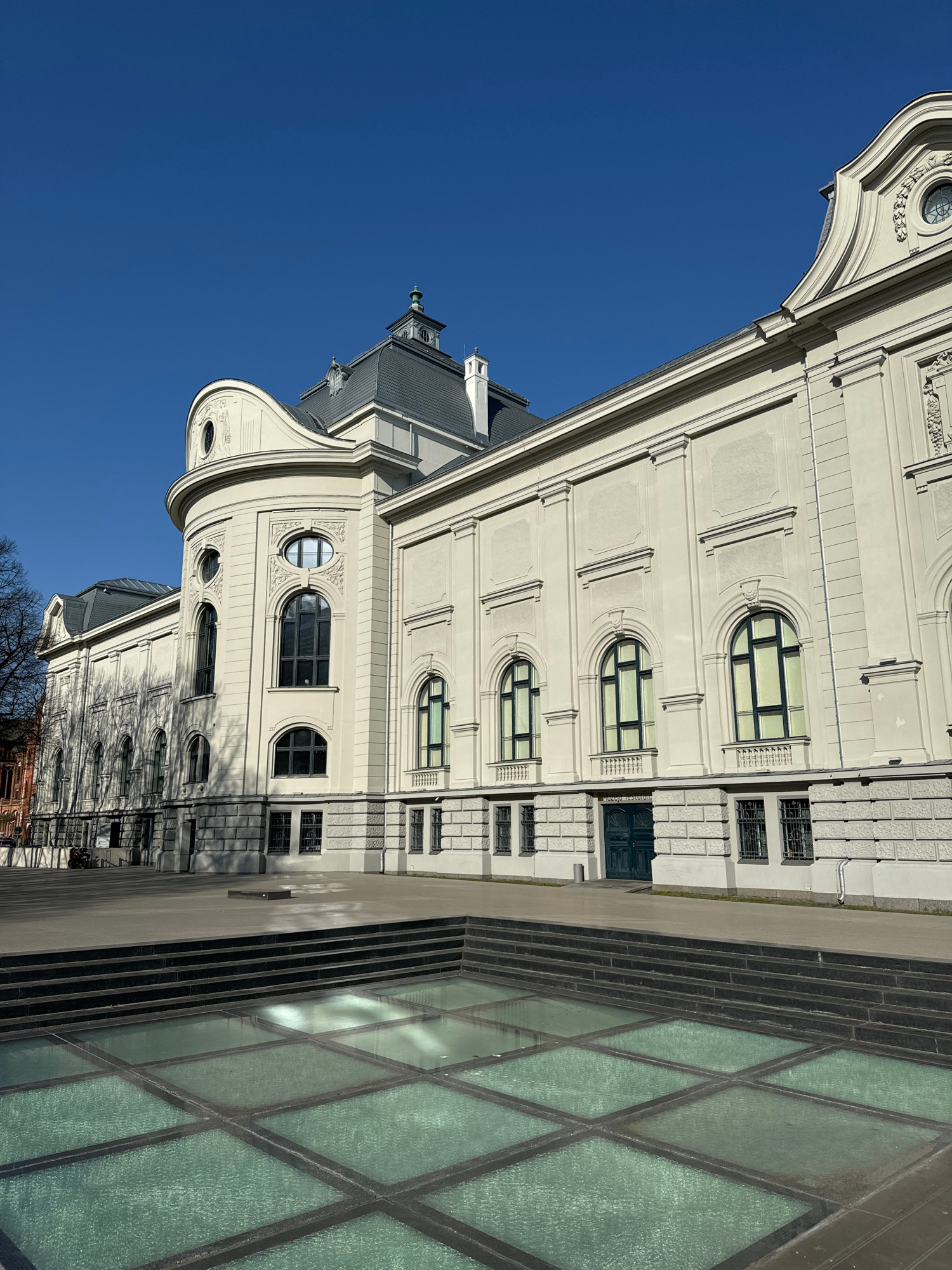 This image shows the Latvian National Opera in Riga, Latvia. The building's facade is characterized by a pale stone exterior with ornate detailing, including arched windows and decorative molding. A m…read more