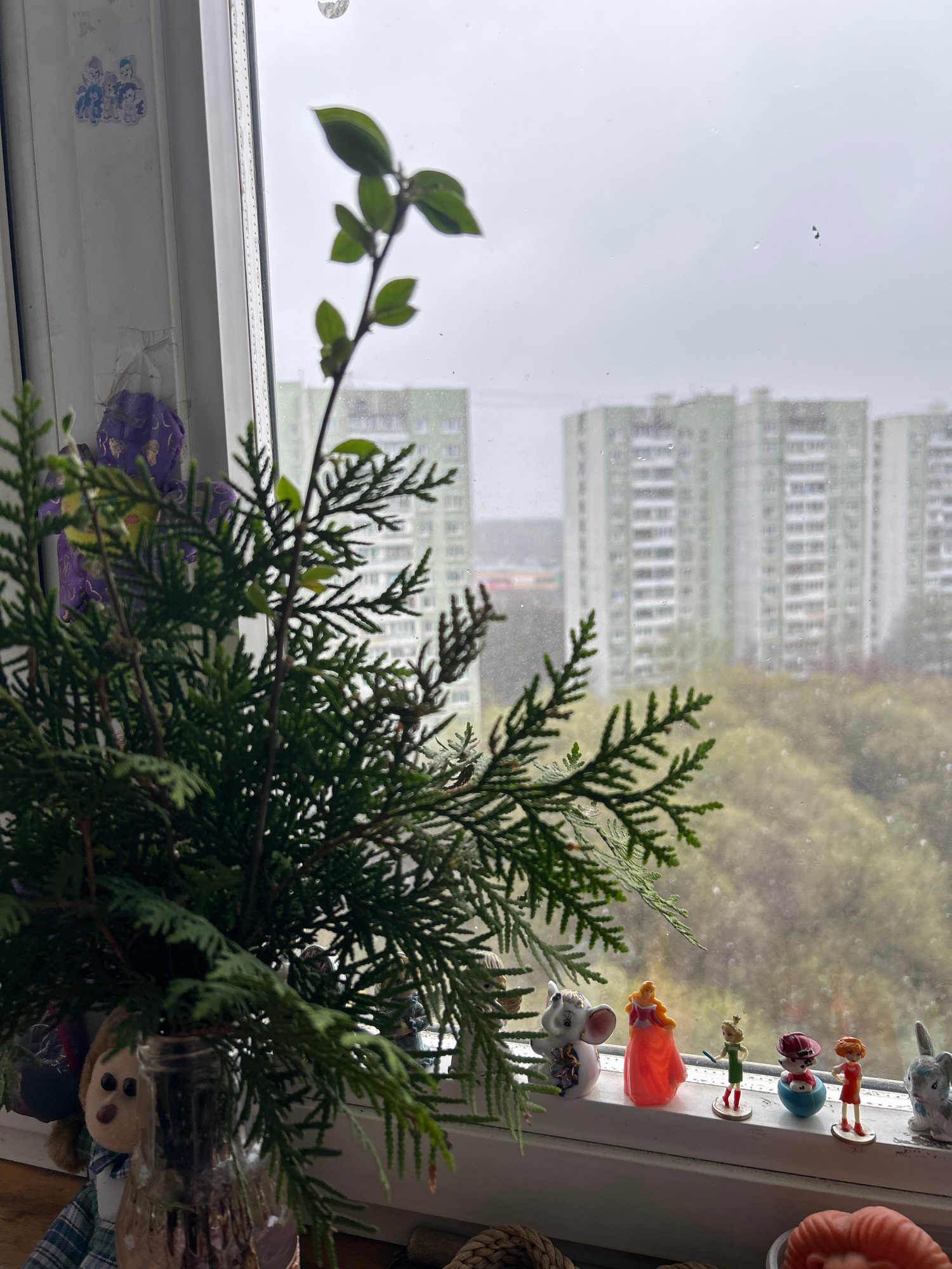 Here is a description of the image: The image depicts a view from a window, likely in a residential building. In the foreground, there is a plant with green leaves and branches sitting on the windows…read more