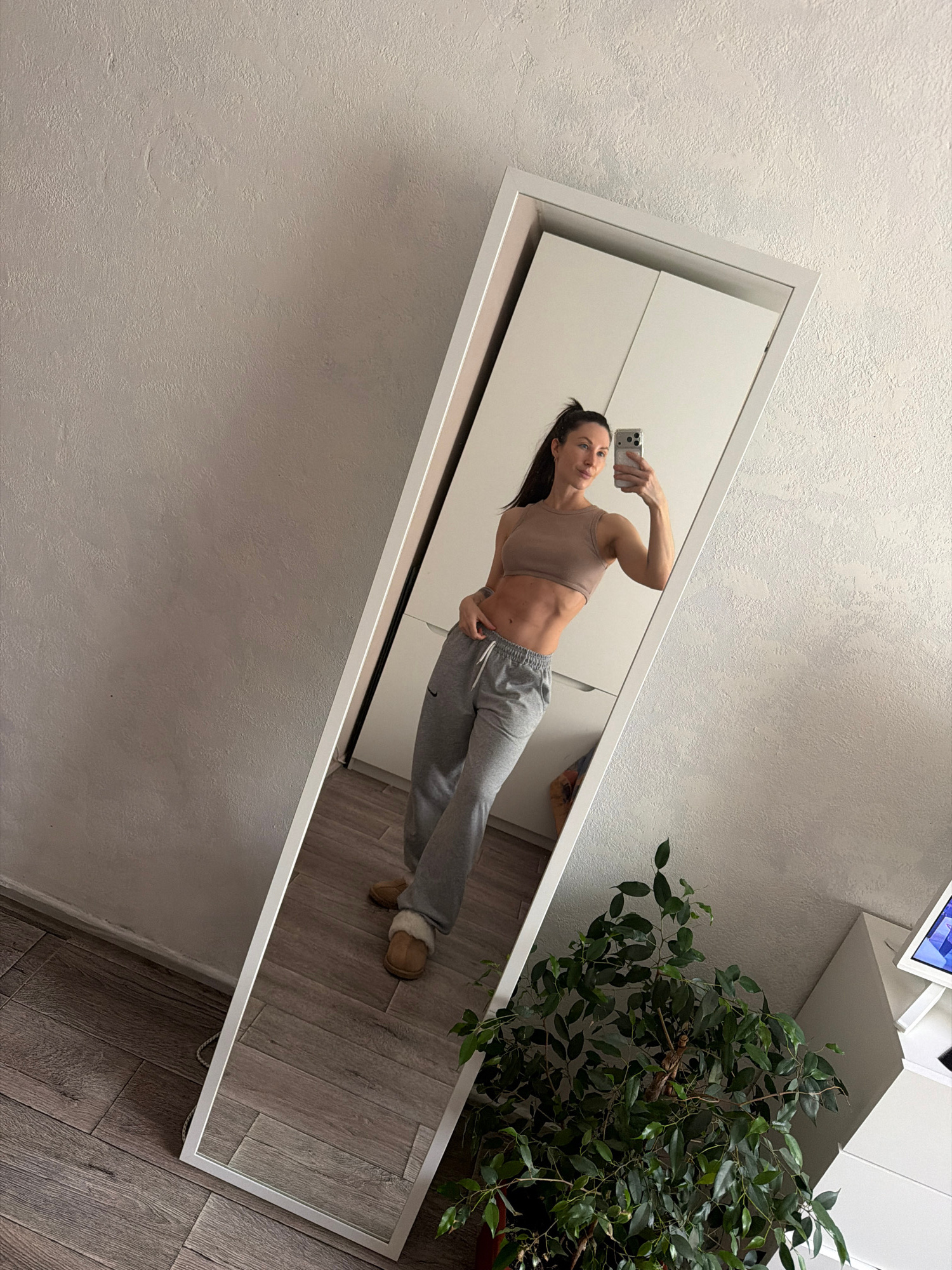 A woman is taking a mirror selfie inside a building. The mirror is leaning against a wall with white cabinetry and a potted plant visible. The woman is wearing a sports bra and sweatpants. The floorin…read more
