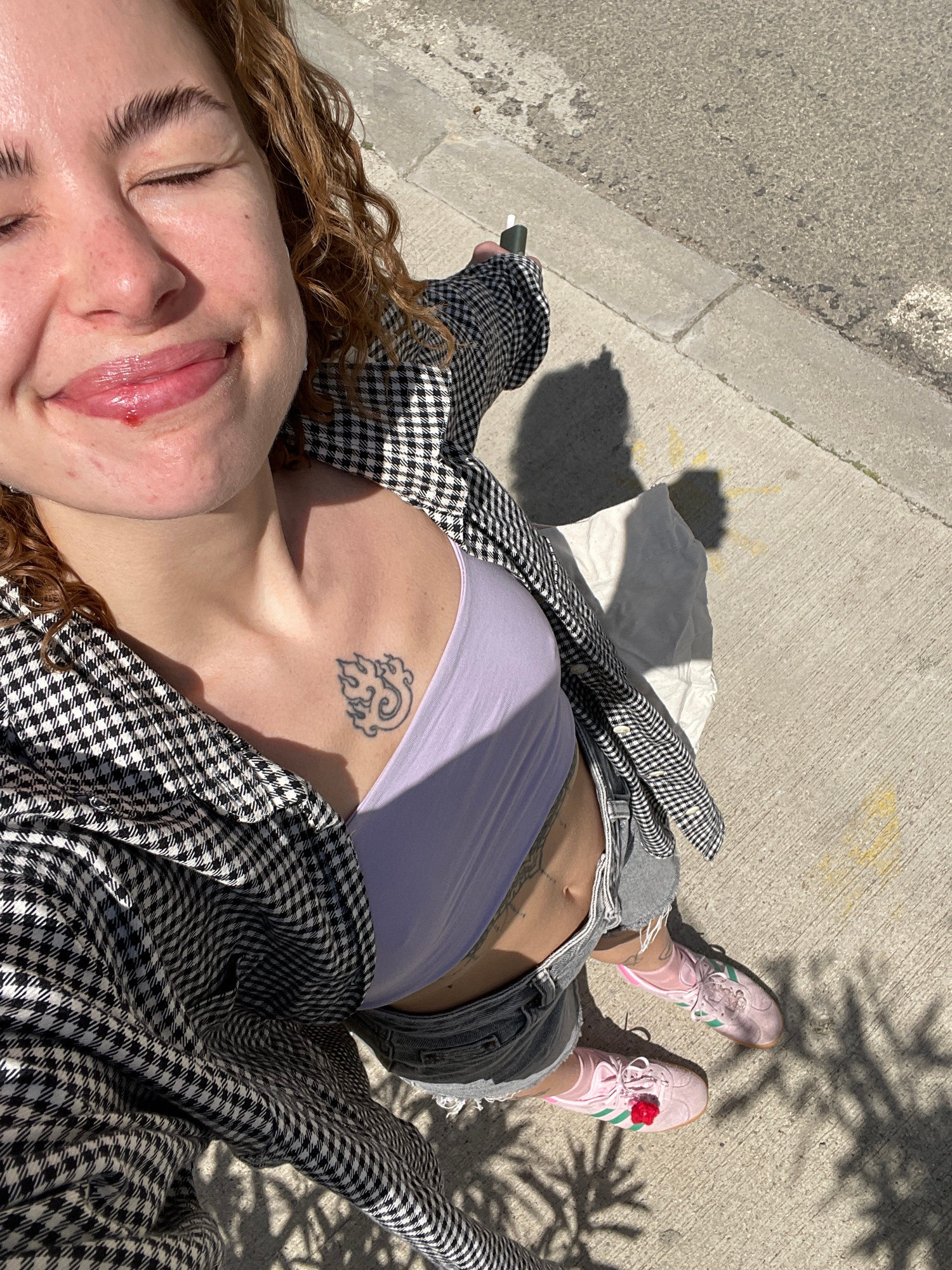 A young person lies on a concrete sidewalk in direct sunlight. The location is not discernible as Boreti, Montenegro, from the image alone. The individual has curly, reddish-brown hair, and their eyes…read more