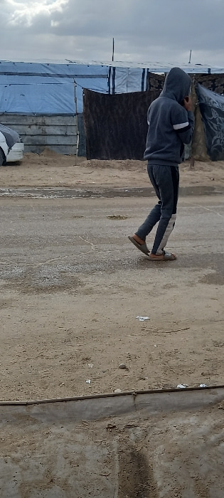 The image portrays an outdoor scene in Khan Yunis, Palestinian Territory, under an overcast sky. In the foreground, a single individual is captured from behind, walking towards the left side of the fr…read more