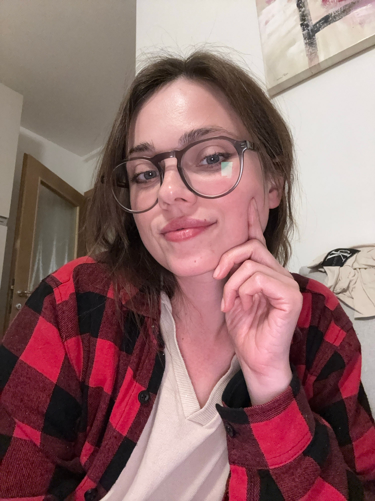 A person with brown hair and glasses is wearing a red and black flannel shirt over a white undershirt. The person is touching their face with their right hand. In the background, there is a painting o…read more
