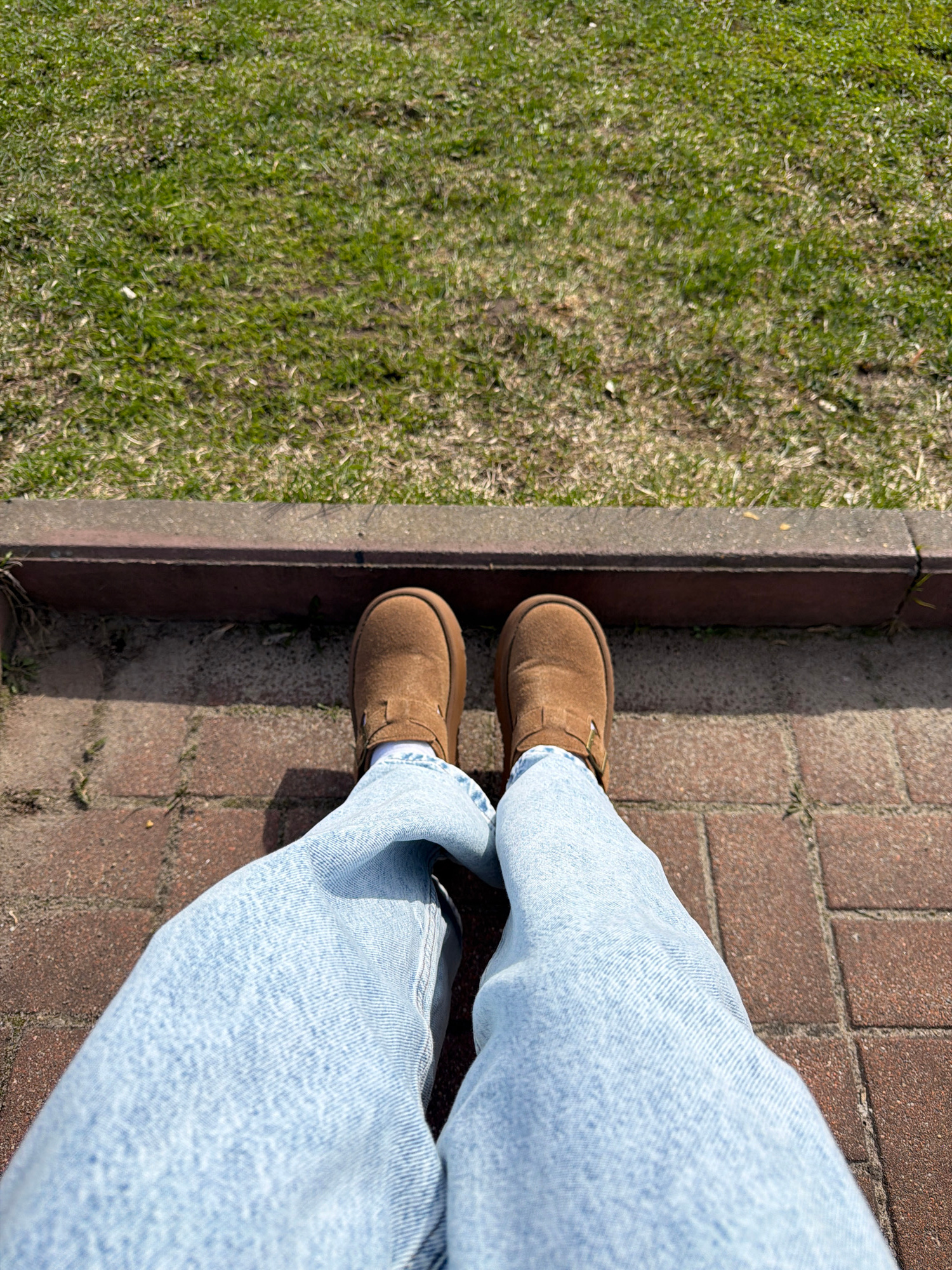 The image depicts a person standing on a brick pathway adjacent to a strip of grass. The person is wearing light-wash denim jeans and brown suede-like ankle boots. The edge of the pathway is marked by…read more