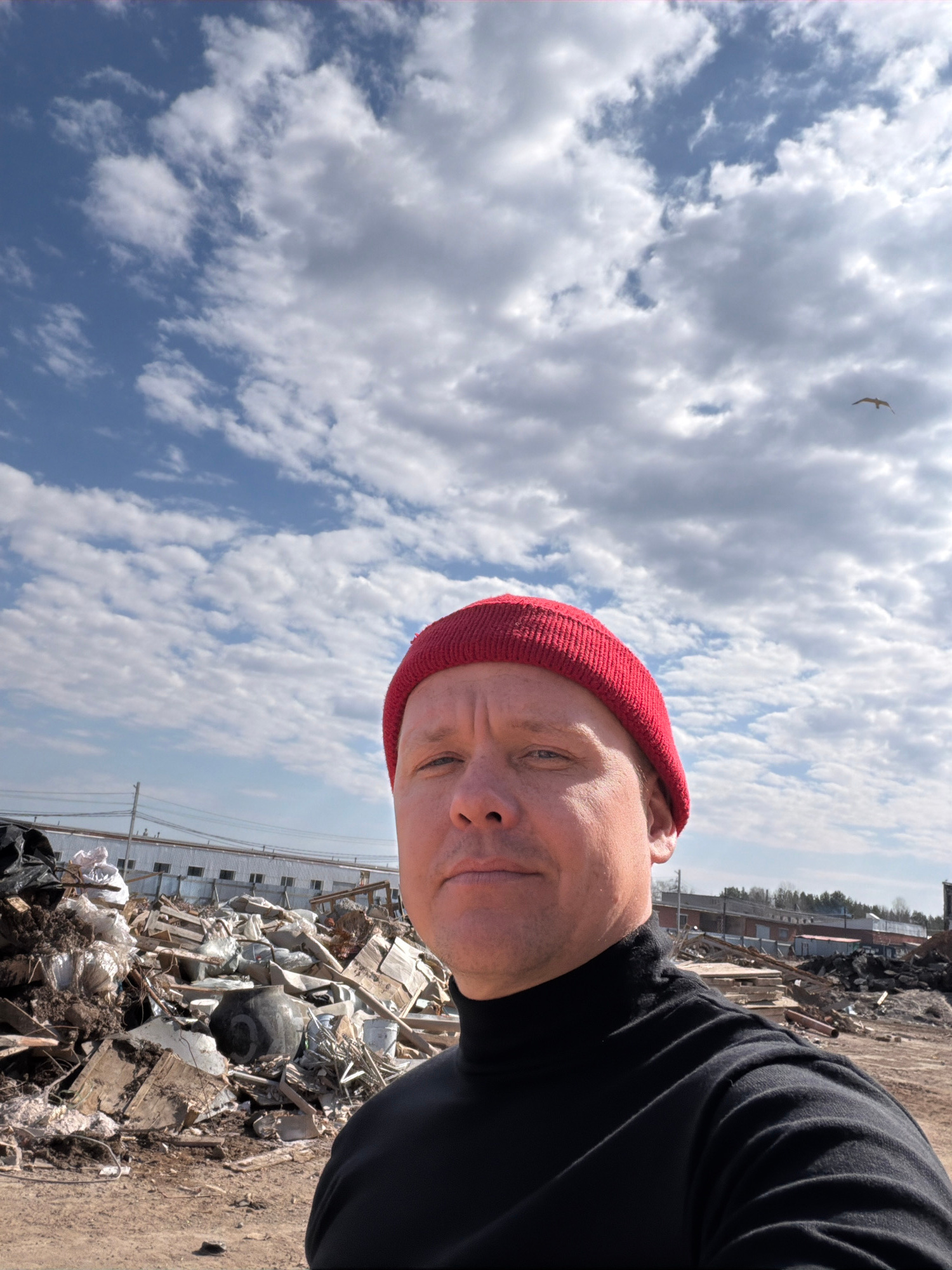 A man is captured in a selfie taken outdoors during the daytime. He is positioned in the foreground, wearing a red beanie and a black long-sleeved shirt or turtleneck, looking directly at the camera w…read more