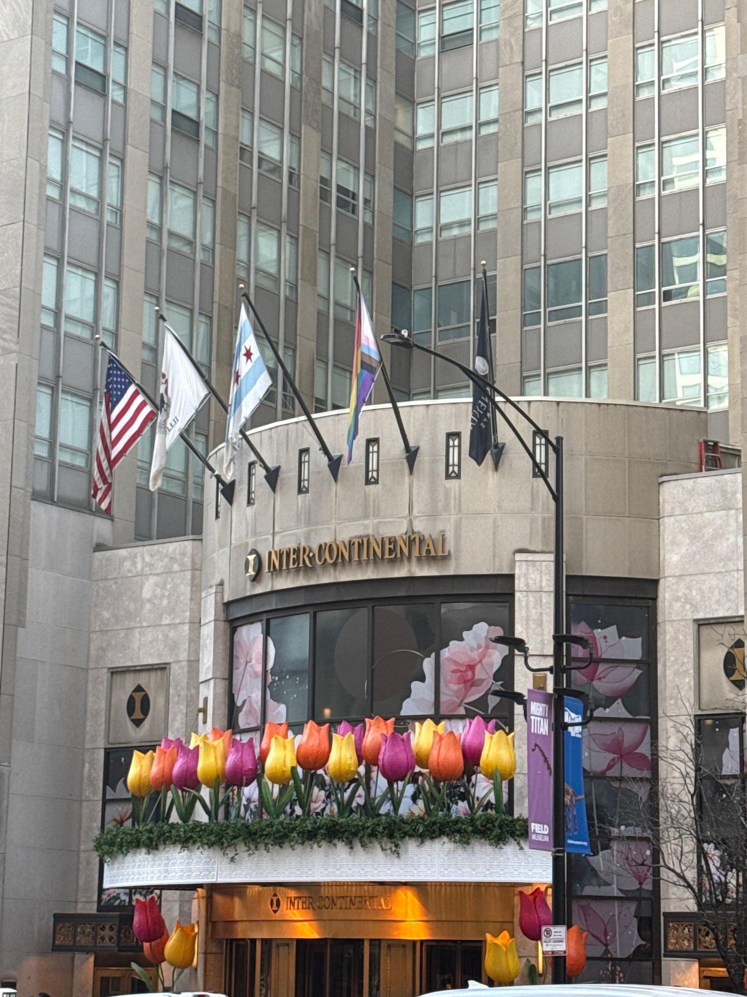 The image shows the InterContinental Chicago Magnificent Mile hotel in Chicago, Illinois, USA. Several flags fly on poles in front of the building, including the American flag, the flag of the State o…read more