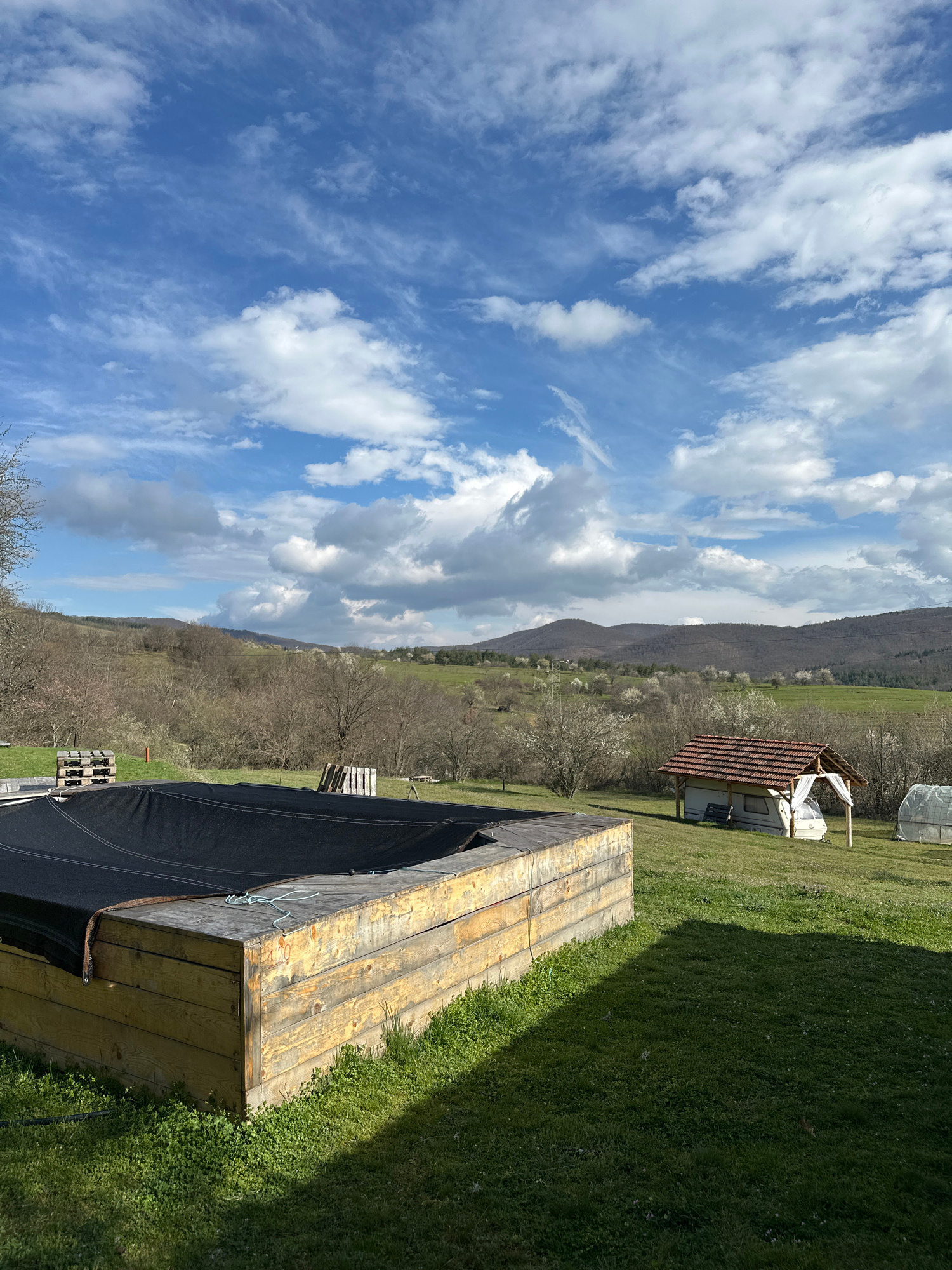 The image shows a rural scene in Mrachenik, Bulgaria. A partially obscured wooden structure covered with a black tarp is in the foreground. Beyond this, a grassy area leads to a trailer with a wooden…read more