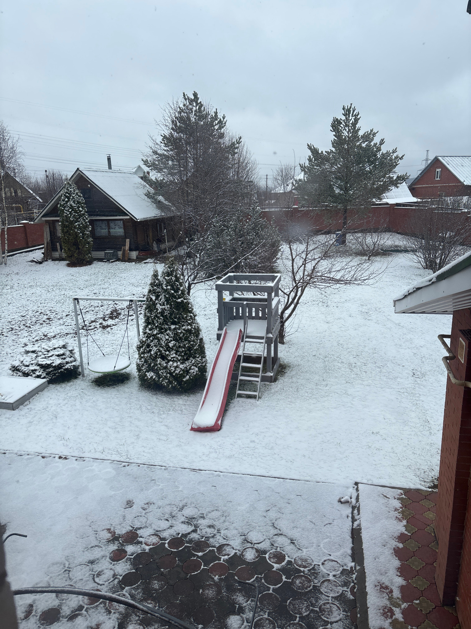 The image shows a snow-covered backyard in Ферма, Russia. A children's playset with a red slide is partially visible. A swing set and a few evergreen bushes are also present. A house is visible in the…read more