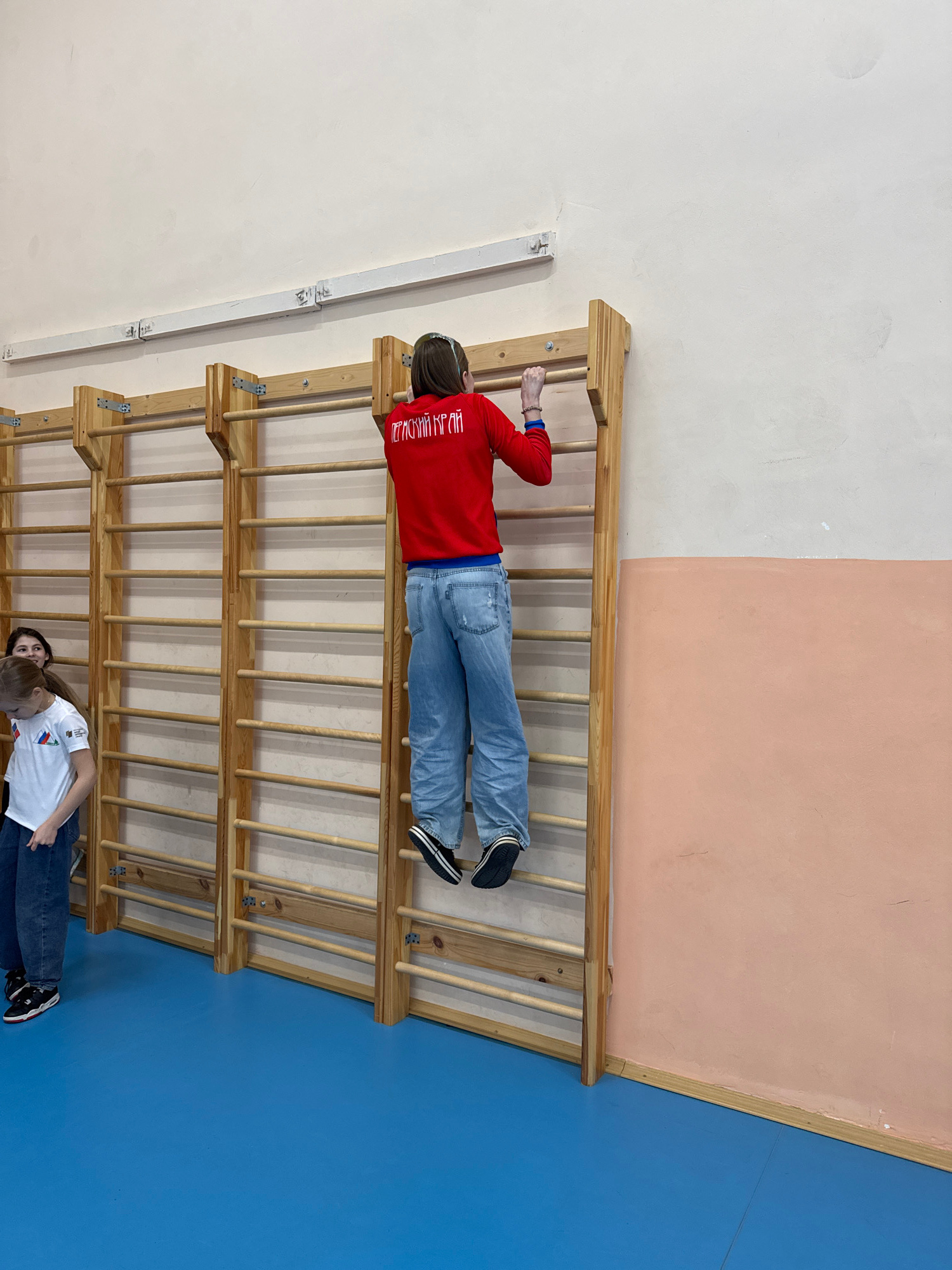 A man wearing a red sweater and jeans is lying horizontally on a wooden ladder-like structure. Another person is visible at the bottom of the ladder structure, and the background consists of three wal…read more