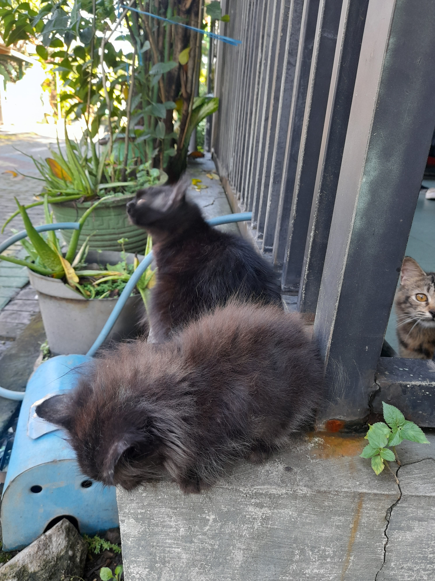 A medium-angle, outdoor, natural light photograph shows two cats in Gelam, Indonesia. One cat peeks from behind a barrier made of horizontal steel slats. The other cat, with long, black fur, stands ne…read more