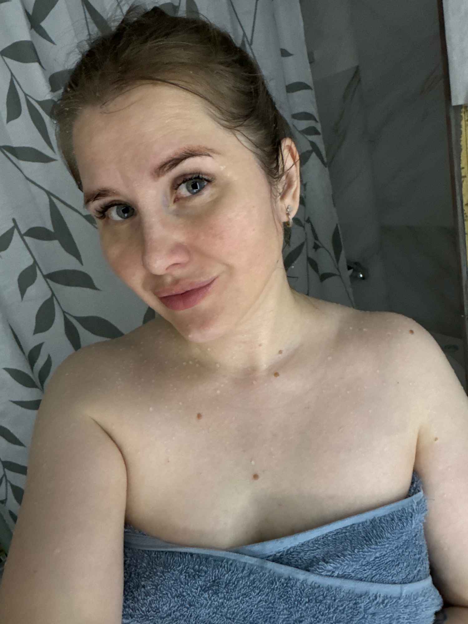 A fair-skinned woman with light brown hair and blue eyes is depicted from a close, angled perspective. She is partly covered by a blue towel. Droplets of water are visible on her skin and hair. The ba…read more