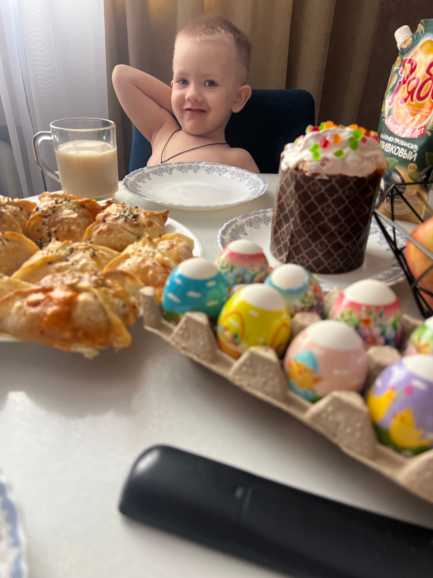 A slightly unfocused high-angle shot depicts a table laden with Easter treats, including decorated eggs in a cardboard carton, an Easter cake with colorful sprinkles, and pastries sprinkled with black…read more
