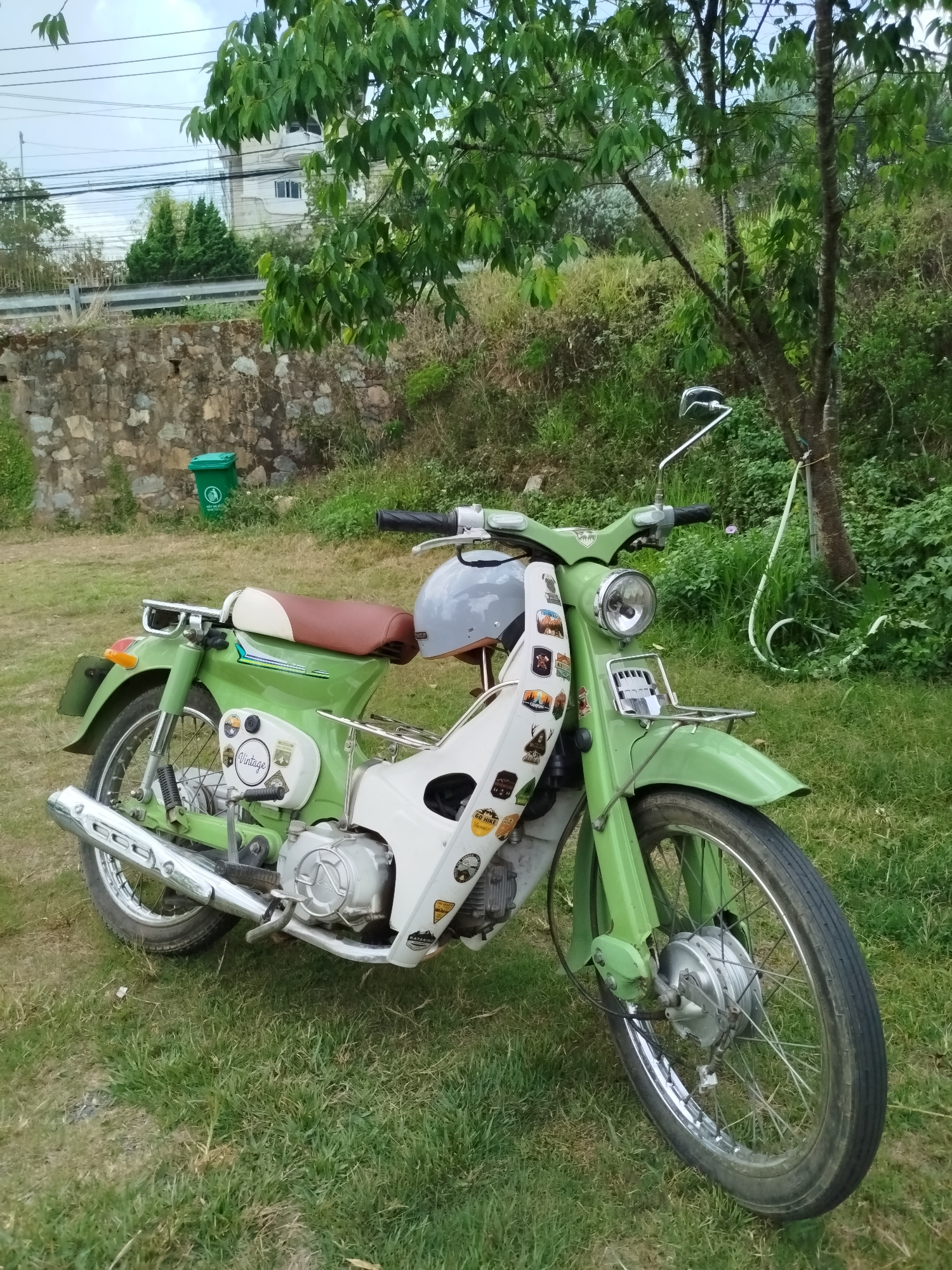 The image presents a light green and white vintage motorcycle parked on a grassy lawn. The motorcycle has a brown and beige seat, chrome accents, and decorative stickers on the white fairing. A grey h…read more