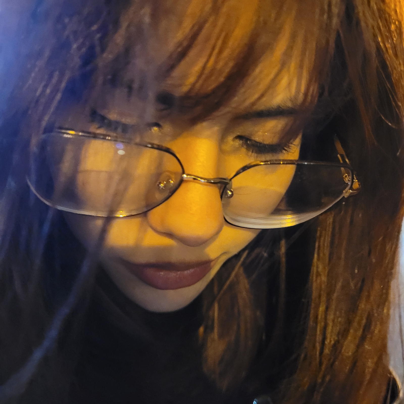 The image depicts a person's face in profile, with eyeglasses resting on their nose. The individual has light-colored hair with darker roots and visible eyelashes. Their lips appear slightly parted. T…read more