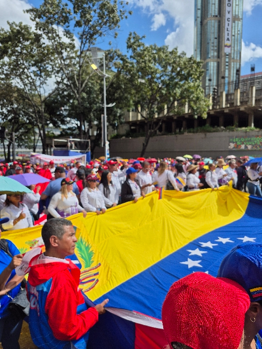 A crowd waves a large Venezuelan flag. The flag's yellow, blue, and red colors are visible, along with the arc of eight white stars and the coat of arms. People wearing red and white clothing are arou…read more