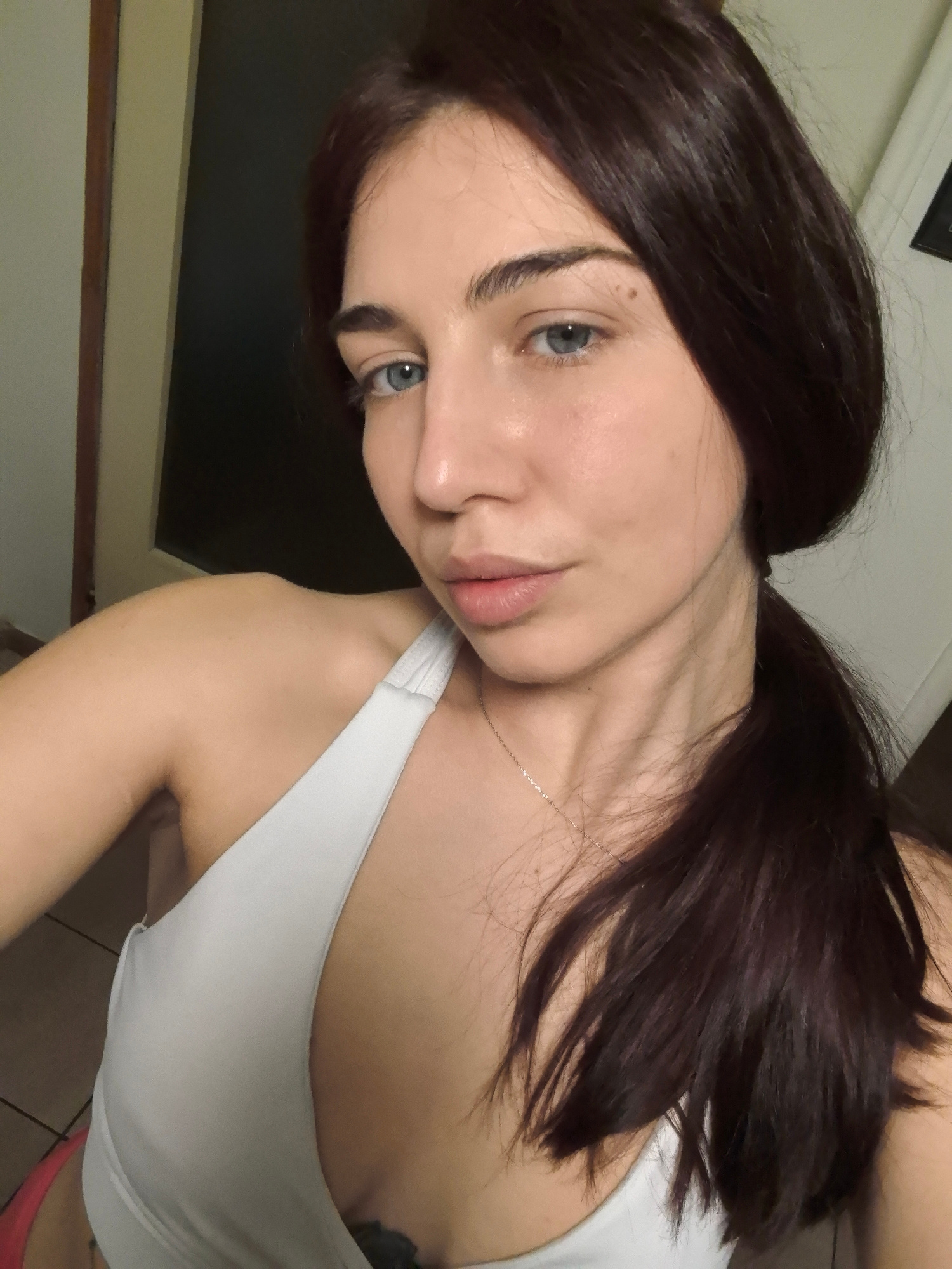 A close-up, indoor shot depicts a young woman with light skin, striking blue eyes, and dark brown hair pulled back in a ponytail. She is wearing a white halter top and a delicate gold necklace. Her fa…read more