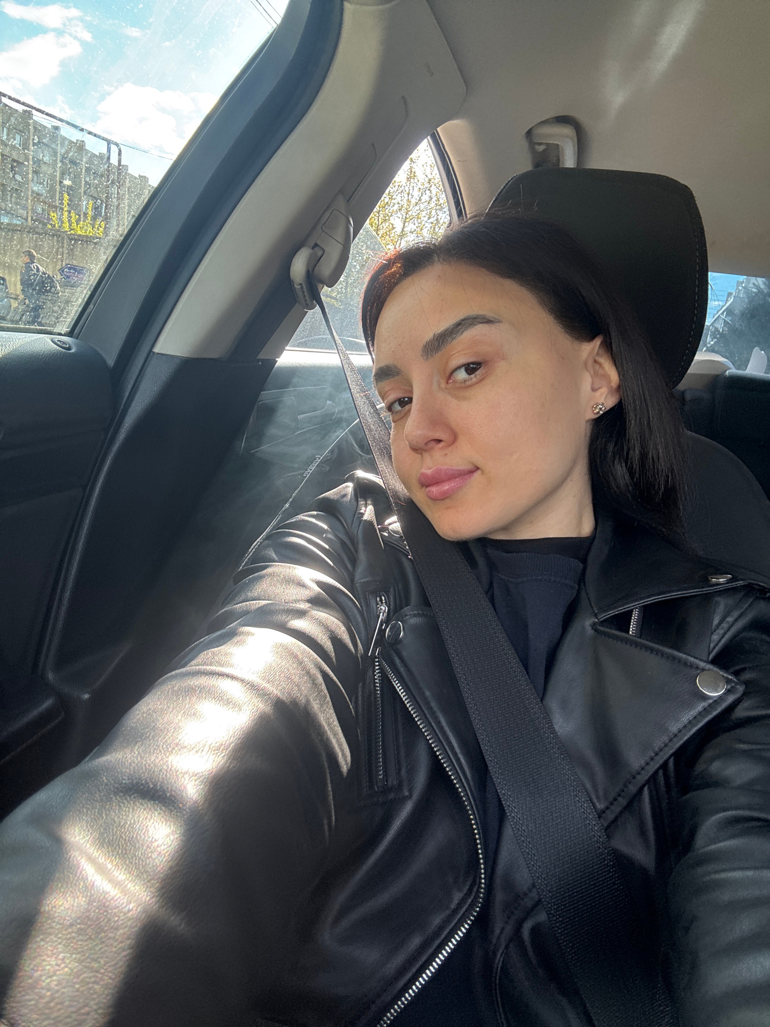 A woman is seated in the driver's seat of a car, wearing a black leather jacket and a seatbelt. She is looking directly at the camera. Outside the car window, a building is visible. Based on building…read more