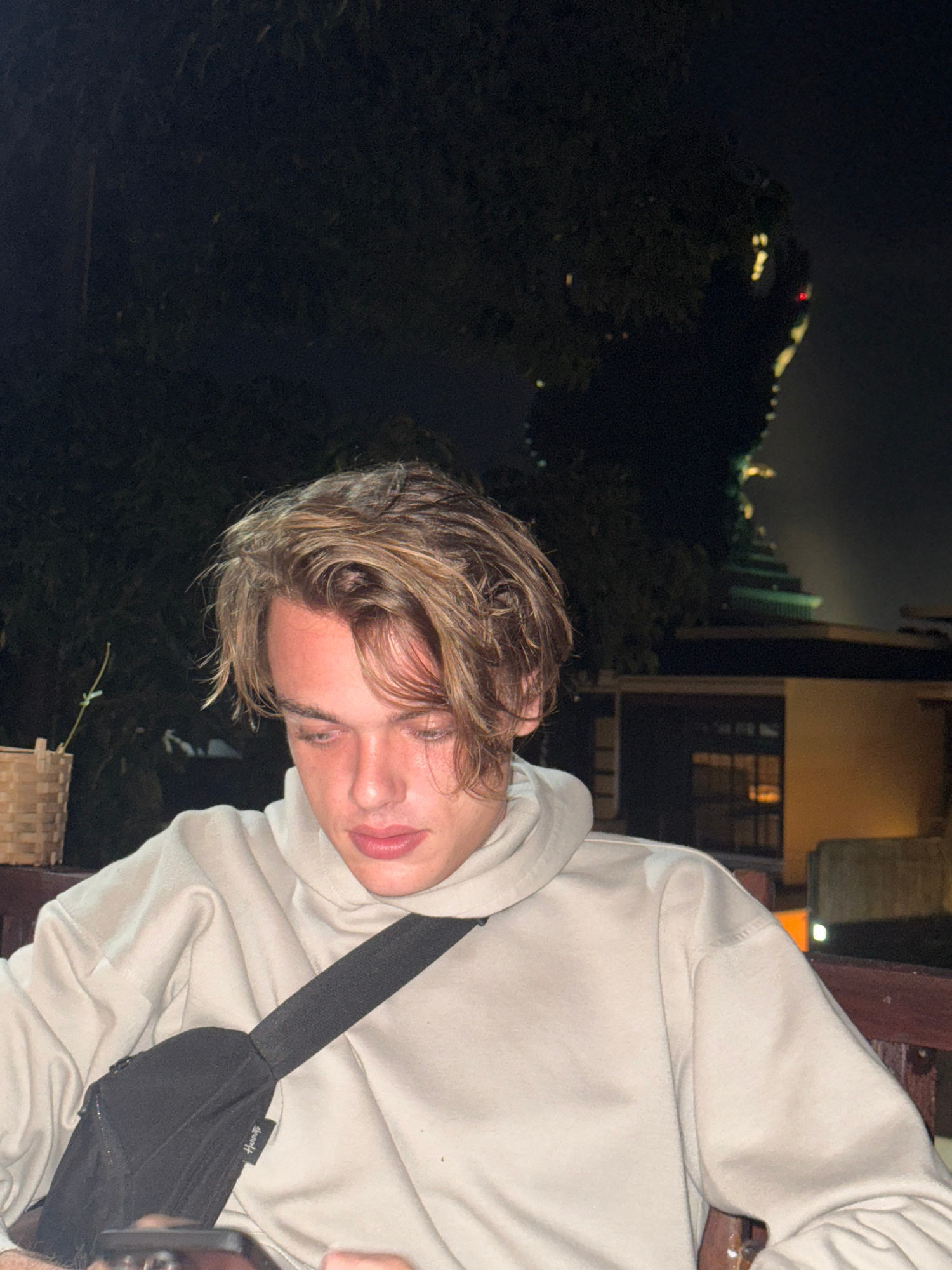 The image, rotated 90 degrees clockwise, captures a young person at night, likely on a balcony or similar elevated outdoor space in Kuta Selatan, Indonesia. The subject has fair skin and light brown, somewhat messy hair, and is wearing a light beige or off-white hooded sweatshirt. Their eyes are cast downwards and slightly to their right, with a calm, neutral expression. A black sling bag is worn across their chest, with the word "Harrods" clearly visible in white text on its surface. A dark object, possibly a smartphone, is partially visible in the bottom right corner, seemingly being held by an unseen hand. A wooden beam or railing frames the upper right portion of the image, and a piece of woven furniture is visible in the bottom left. The background is dominated by the dark night sky. Distant city lights or illuminated structures are scattered across a hilly landscape, with a notable red light prominent on one of the hills. Closer to the foreground, dark trees and foliage are discernible. To the immediate right, part of a building with a dimly lit window adds to the setting. The scene depicts a casual, nocturnal moment. | Open Wire