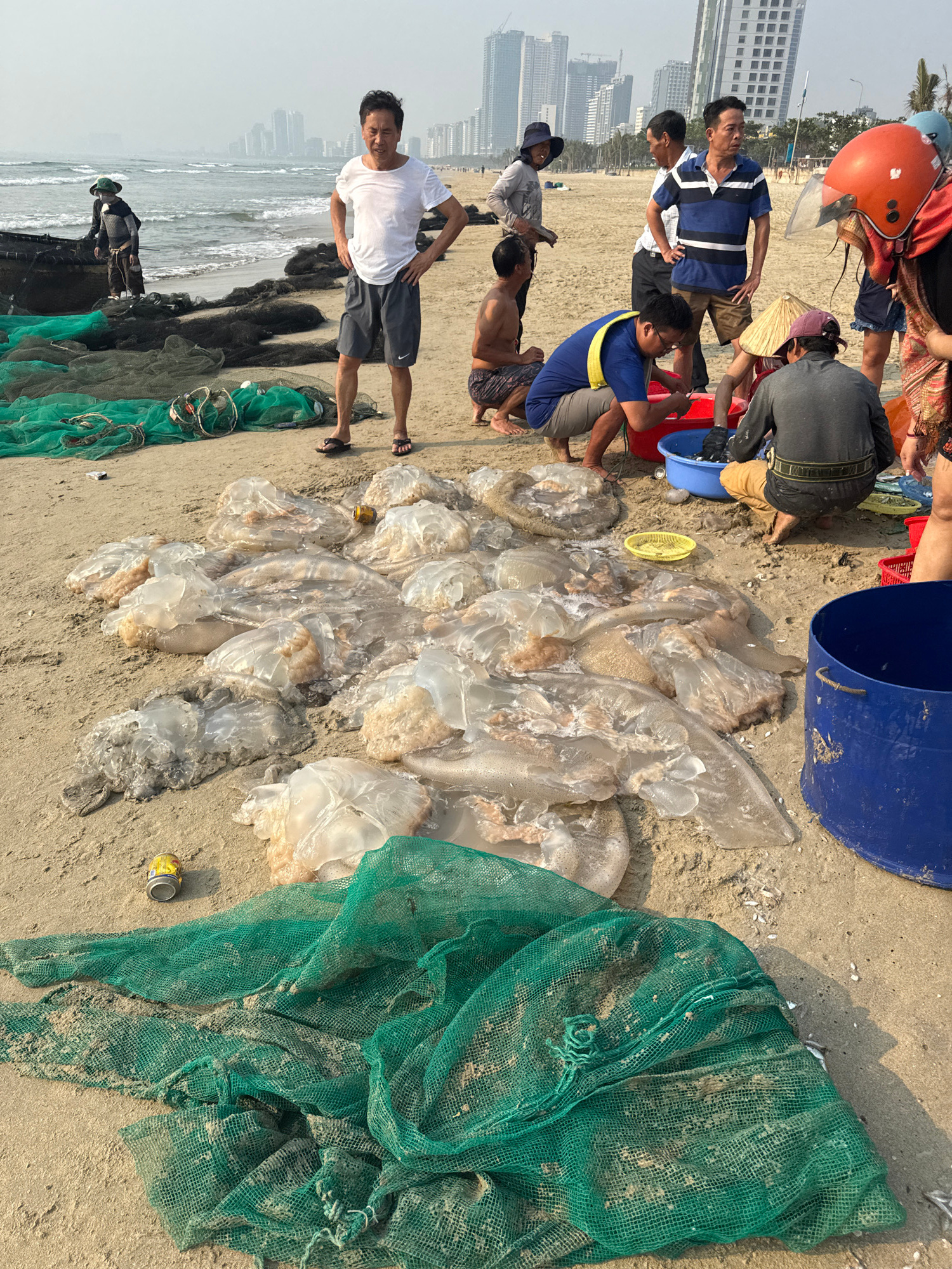 On a beach in Đà Nẵng, Vietnam, a group of people are gathered around a pile of harvested jellyfish. The jellyfish are pale and translucent, lying on the sand next to green fishing nets. People are so…read more