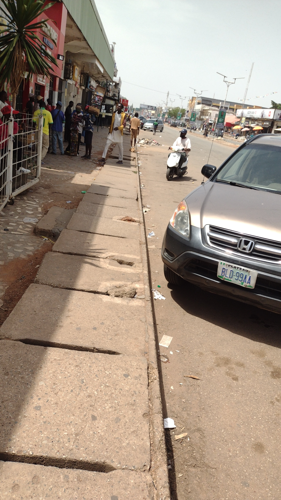 The image depicts a street scene in Jos, Nigeria. A tan-colored Honda is parked along the curb on the right, with its license plate partially visible. People are gathered on the sidewalk next to a row…read more