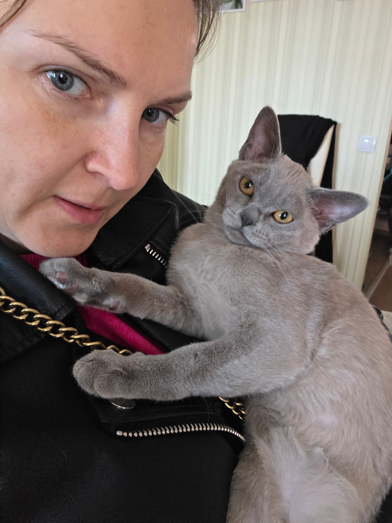A woman with blue eyes is holding a grey cat in her left arm. The cat has yellow eyes and is looking at the camera. The woman is wearing a black leather jacket with a gold chain detail. A pink shirt i…read more
