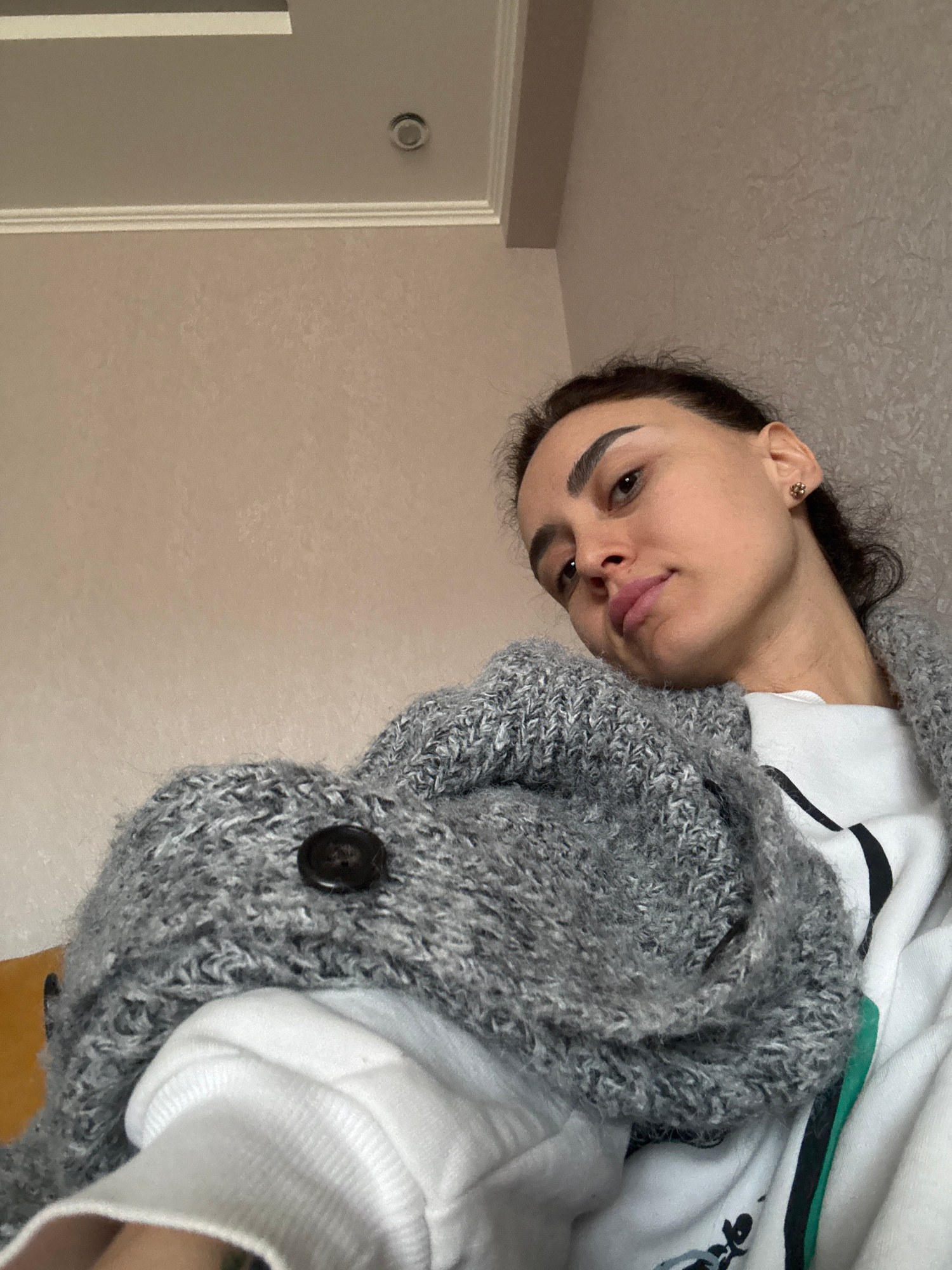 A low-angle, indoor, selfie image shows a person with light skin and dark hair. They are wearing a white shirt and a gray knit cardigan with a dark button. The background includes a light beige wall a…read more
