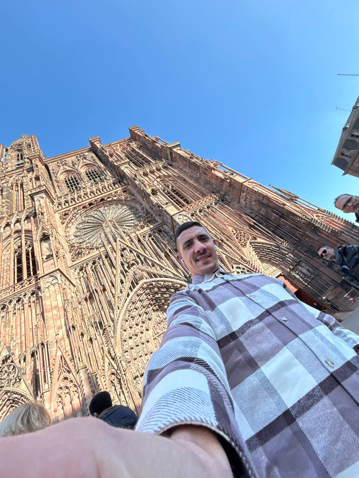 A low-angle selfie captures a male individual positioned in the foreground against the backdrop of the Strasbourg Cathedral in Strasbourg, France. The subject, a male in his 20s or 30s with short darkβ¦read more