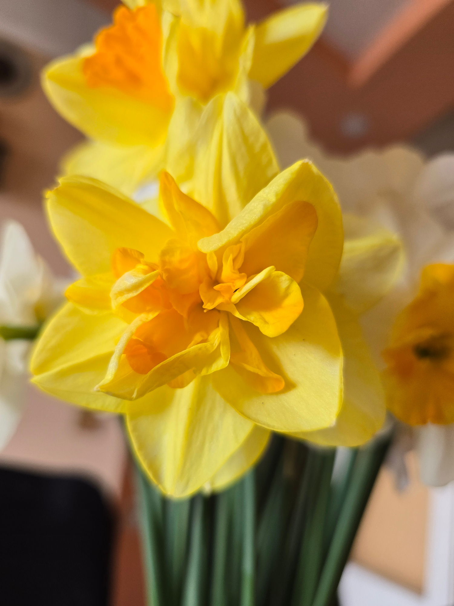 Close-up of yellow and orange daffodils. There is no information in the image that indicates the location in Burgas, Bulgaria.