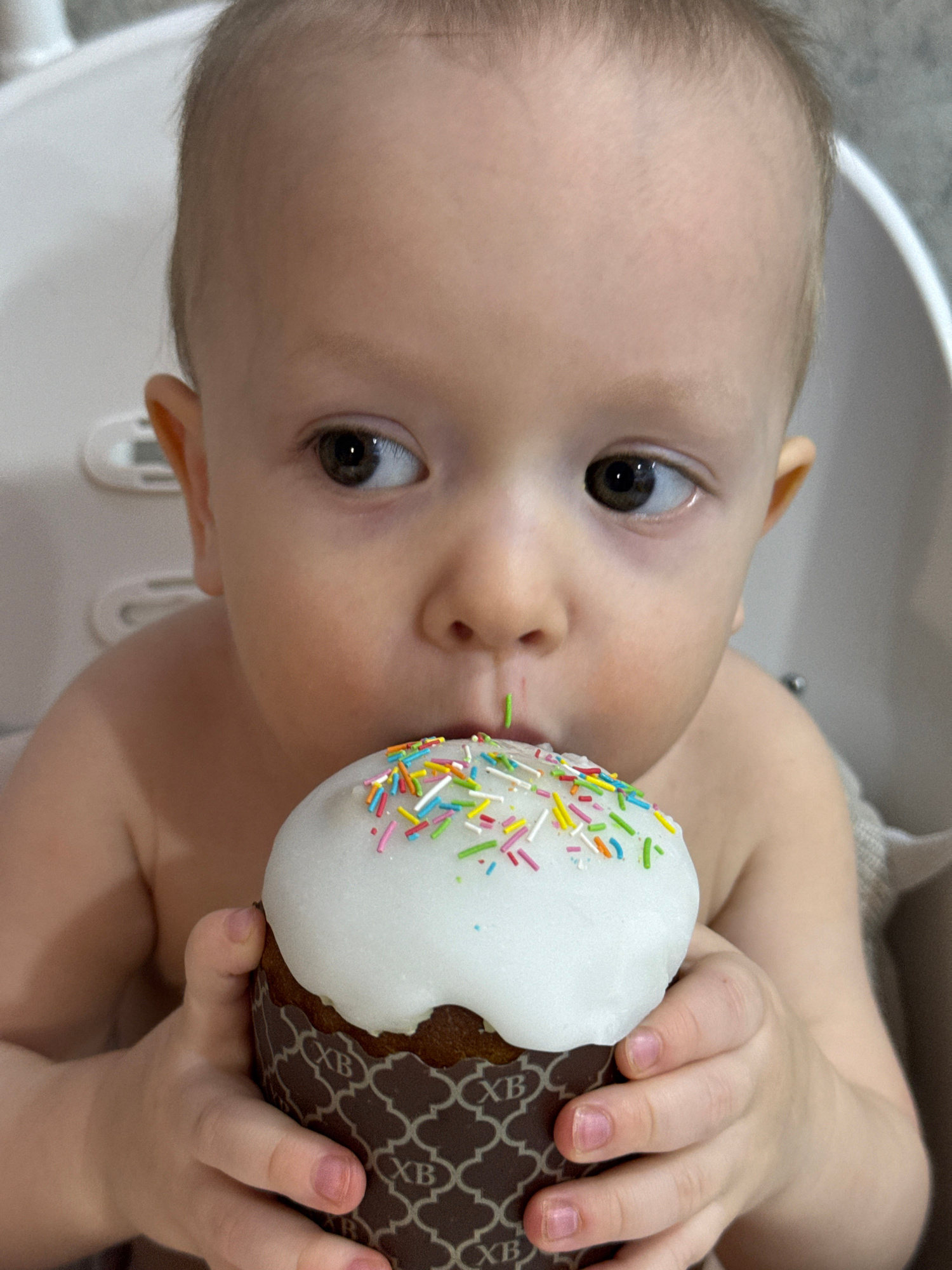 A close-up, angled, indoor shot features a baby with light skin and brown eyes, appearing to be around one year old, holding and tasting a decorated pastry. The baby's face, including the forehead, ey…read more