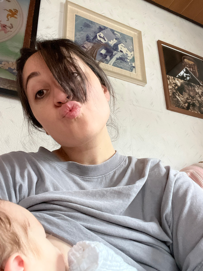 A selfie captures a woman with dark hair, a gray t-shirt, and pursed lips, suggesting a kiss. A baby's head rests near her shoulder, indicating she may be breastfeeding. The backdrop features a textur…read more